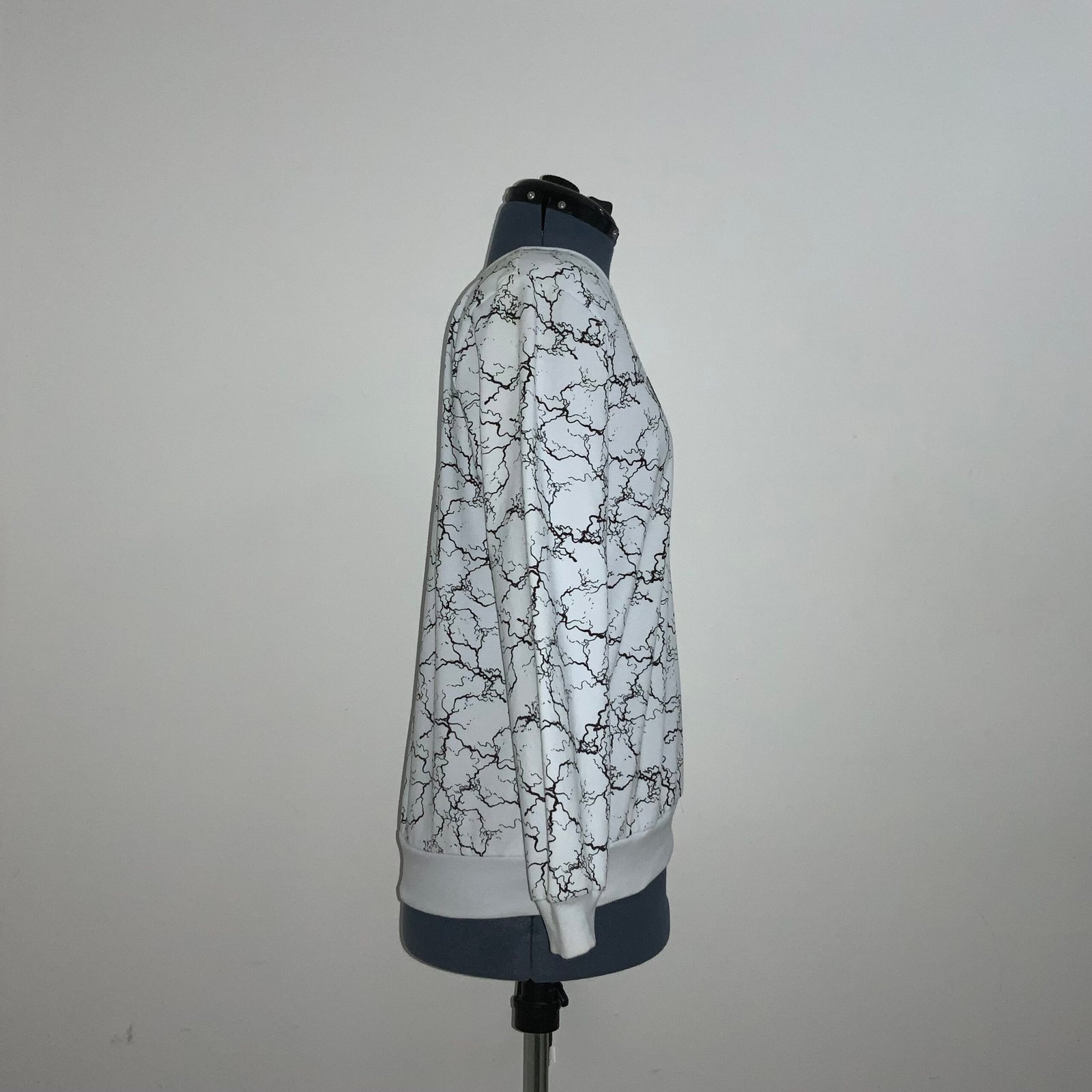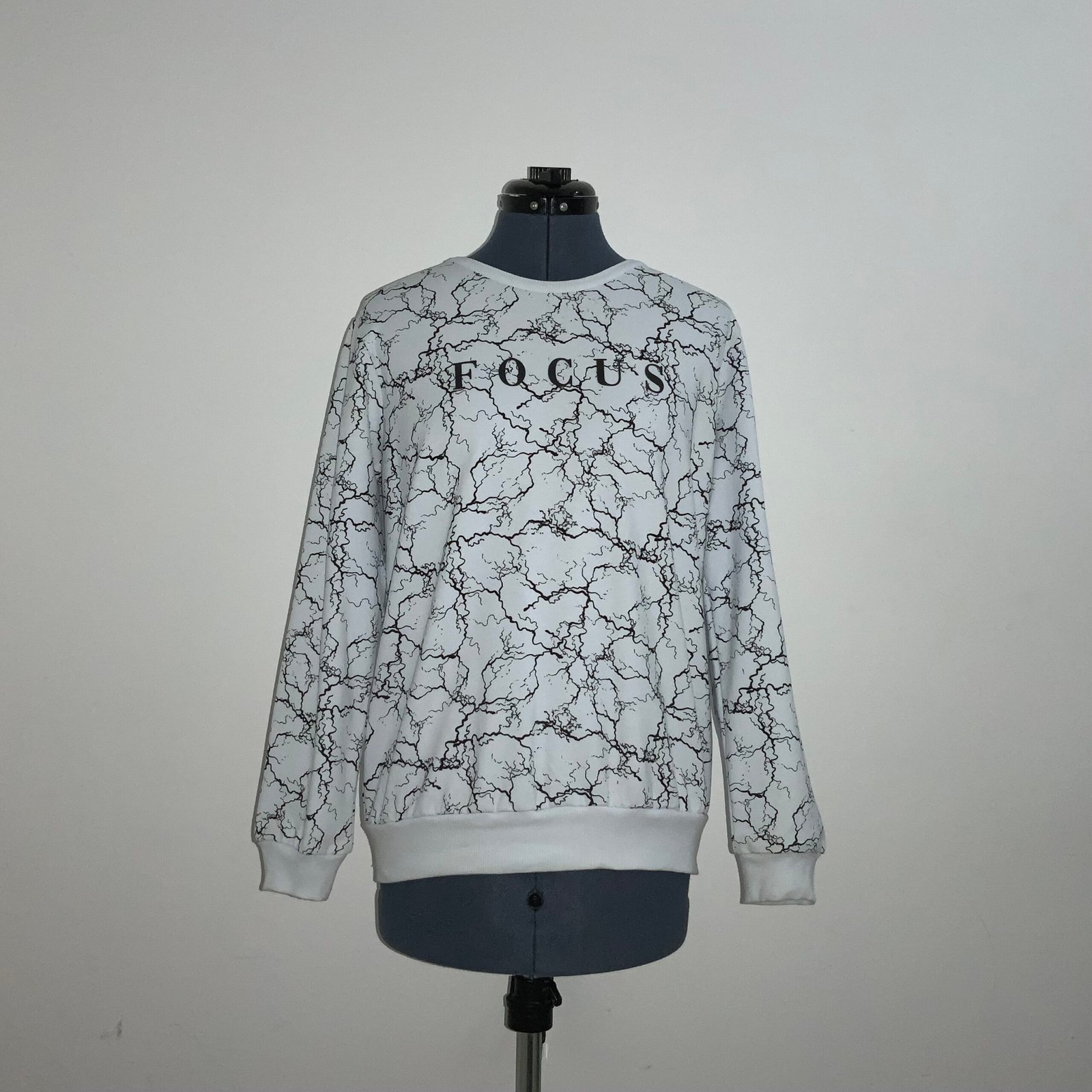 Sudadera color blanca, marca CONTEMPO. Con cuello redondo, mangas largas, estampado (efecto de grietas) y leyenda “FOCUS” y elástico en puños y cintura.