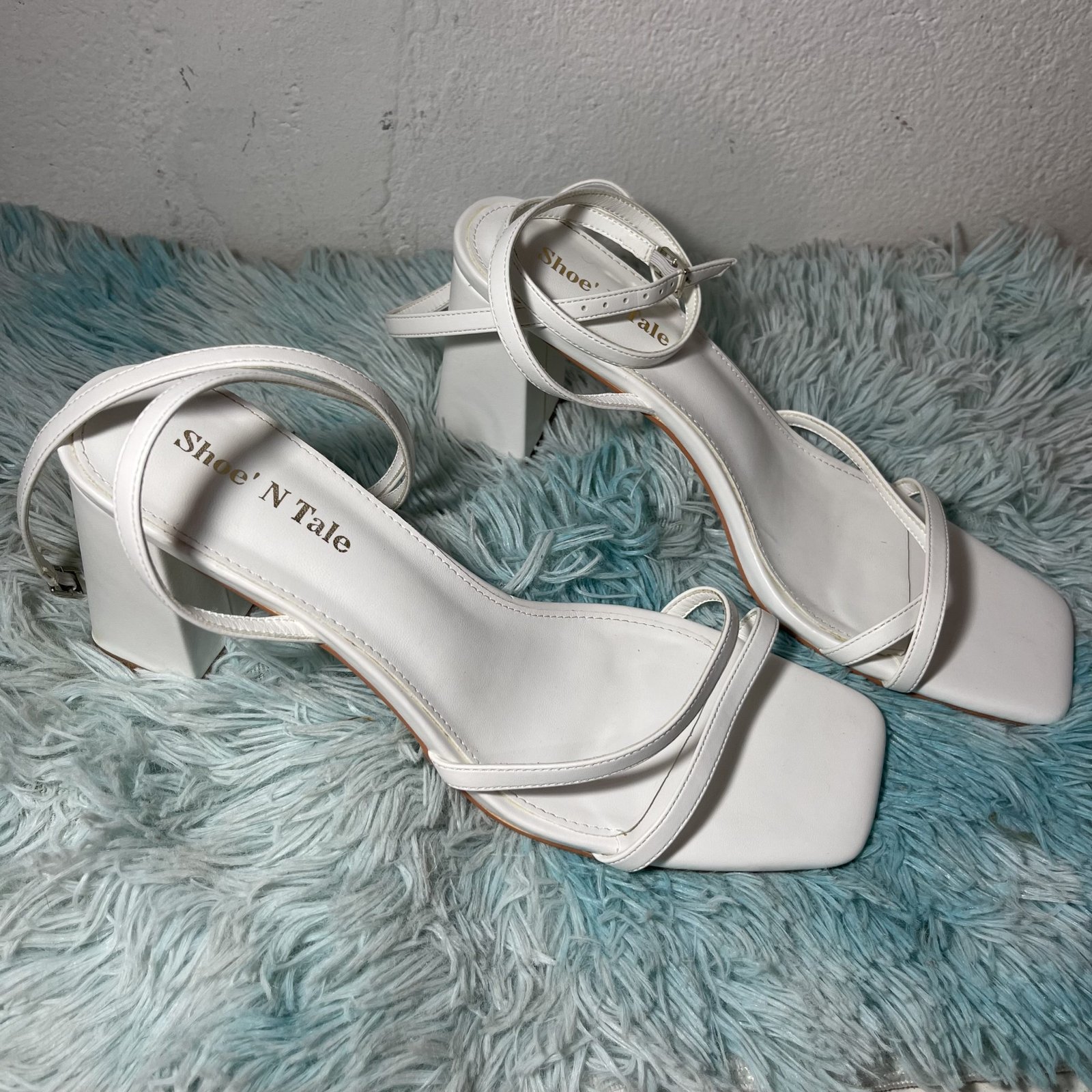 Tacones blancos de tiras, talla 11, con punta cuadrada y tacón grueso de 3.15”. Elegantes y cómodos, ideales para cualquier ocasión.