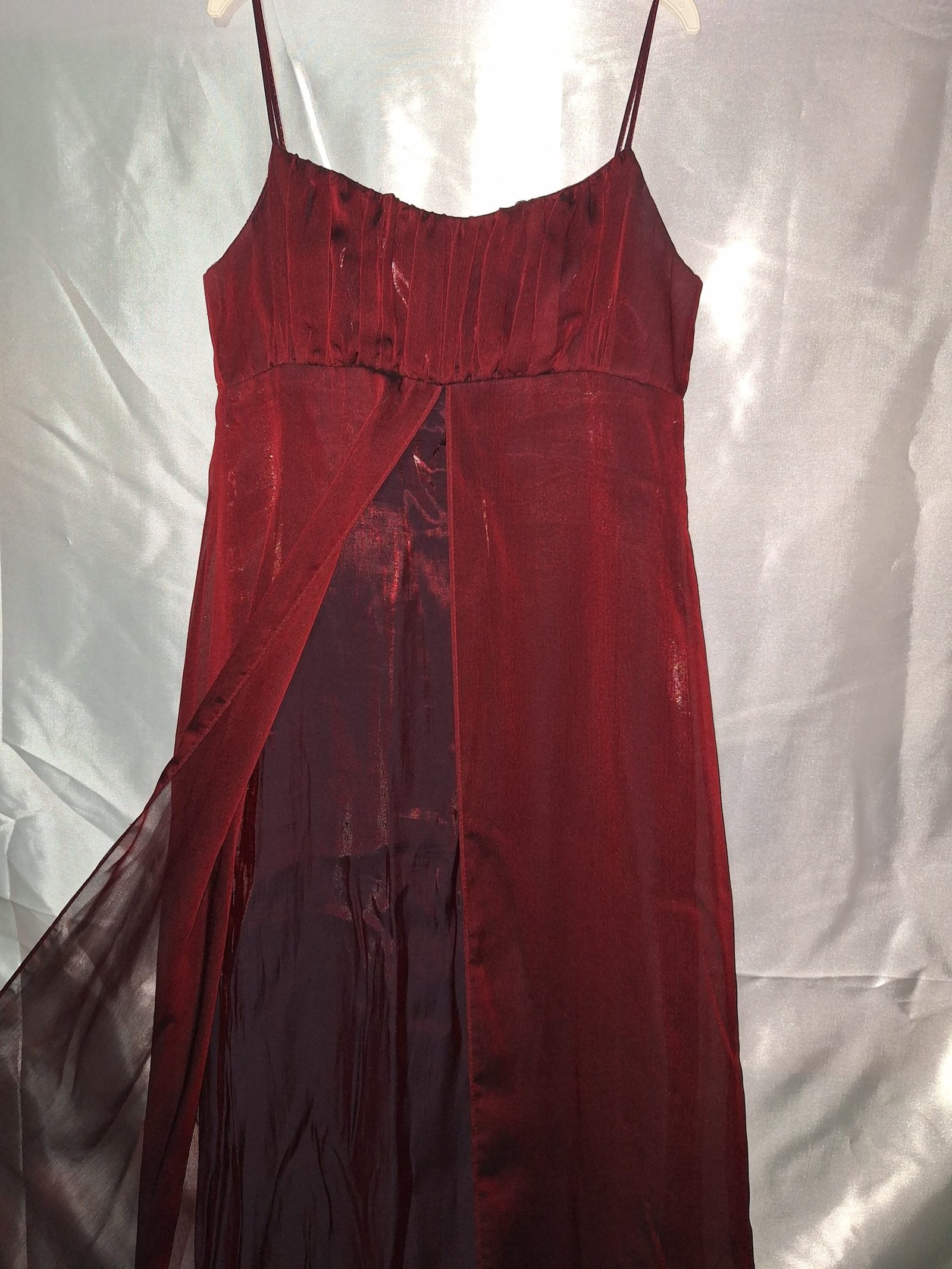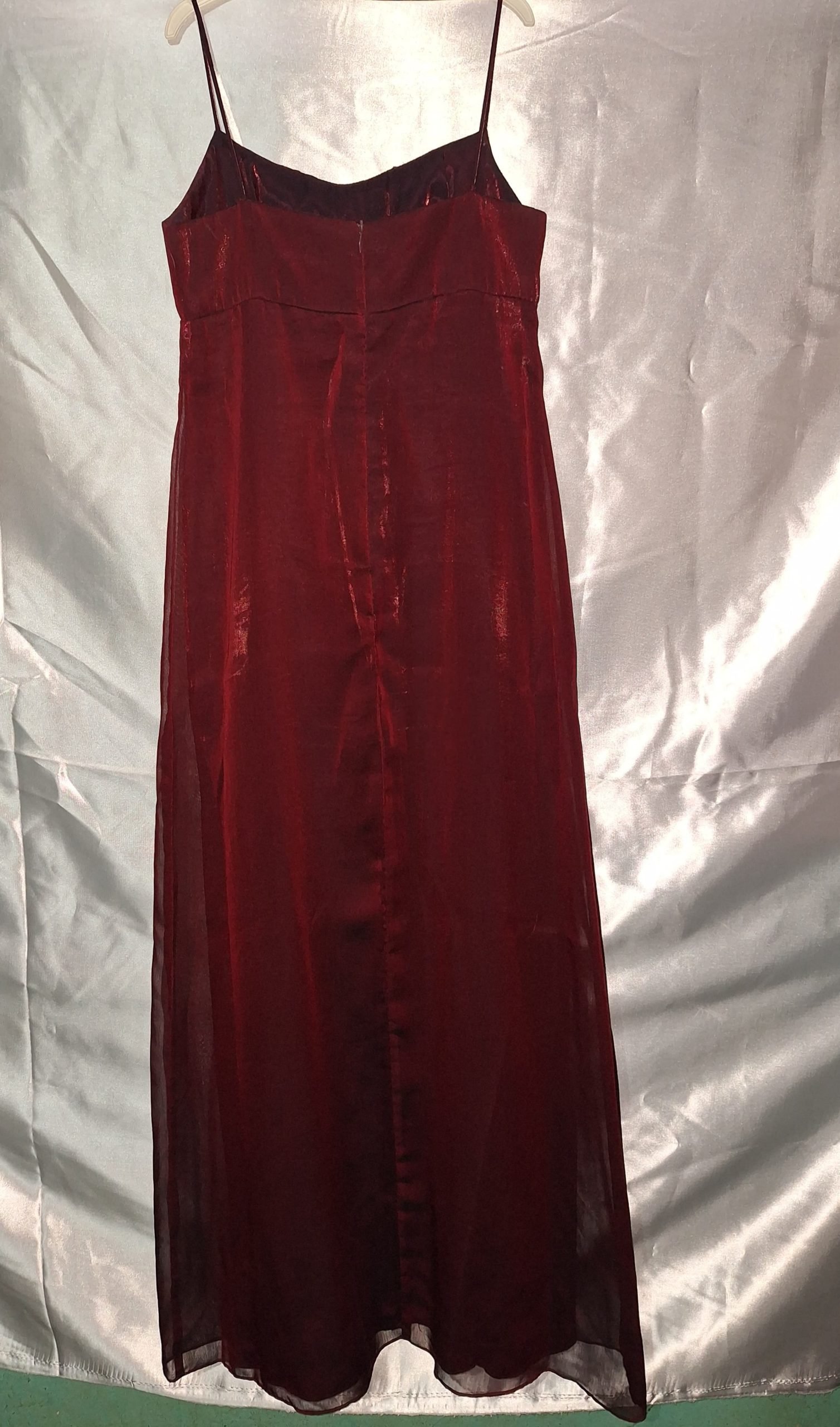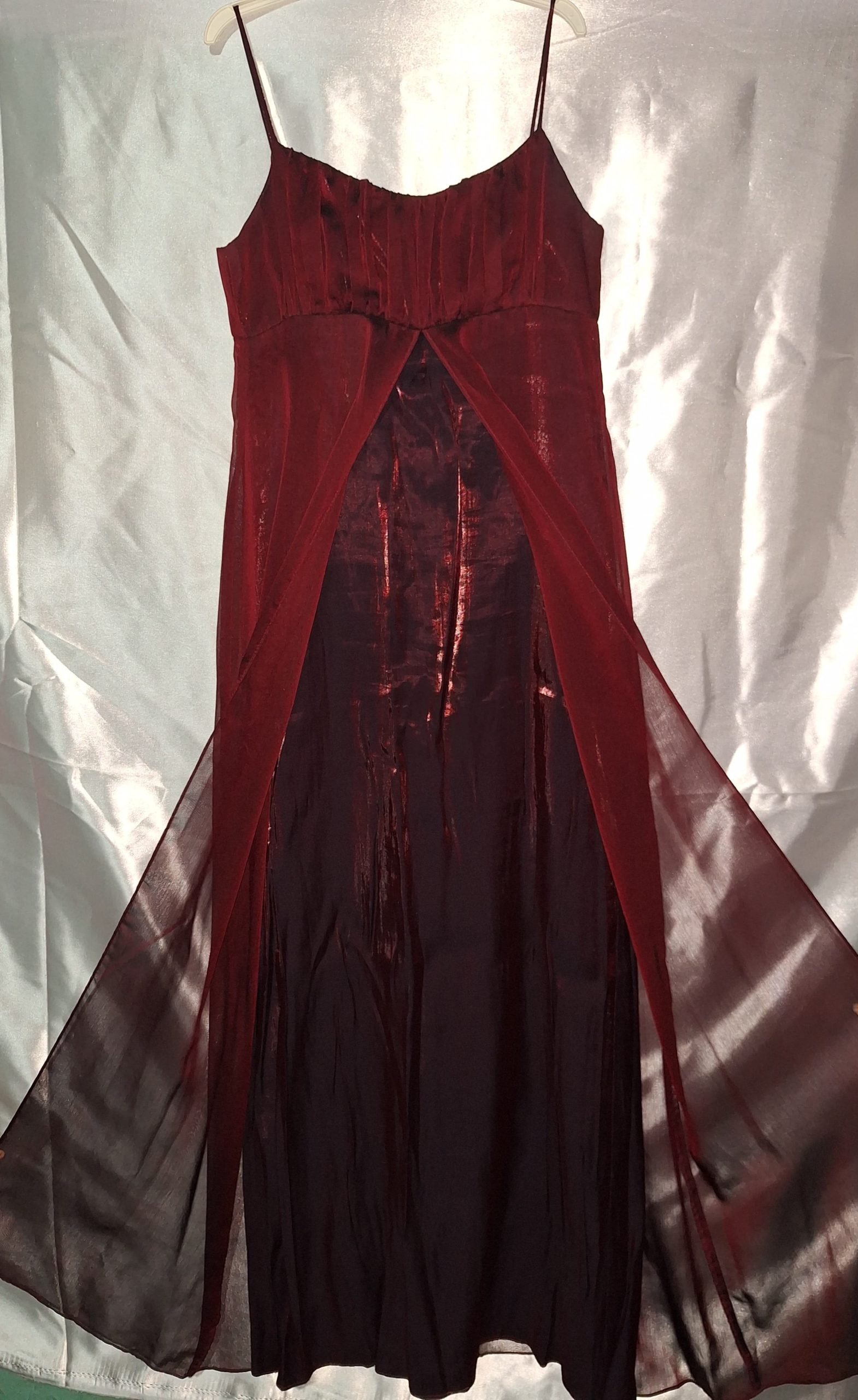 Es un vestido largo con escote recto, color rojo vino en la parte delantera del vestido lleva una media capa abierta de tul.