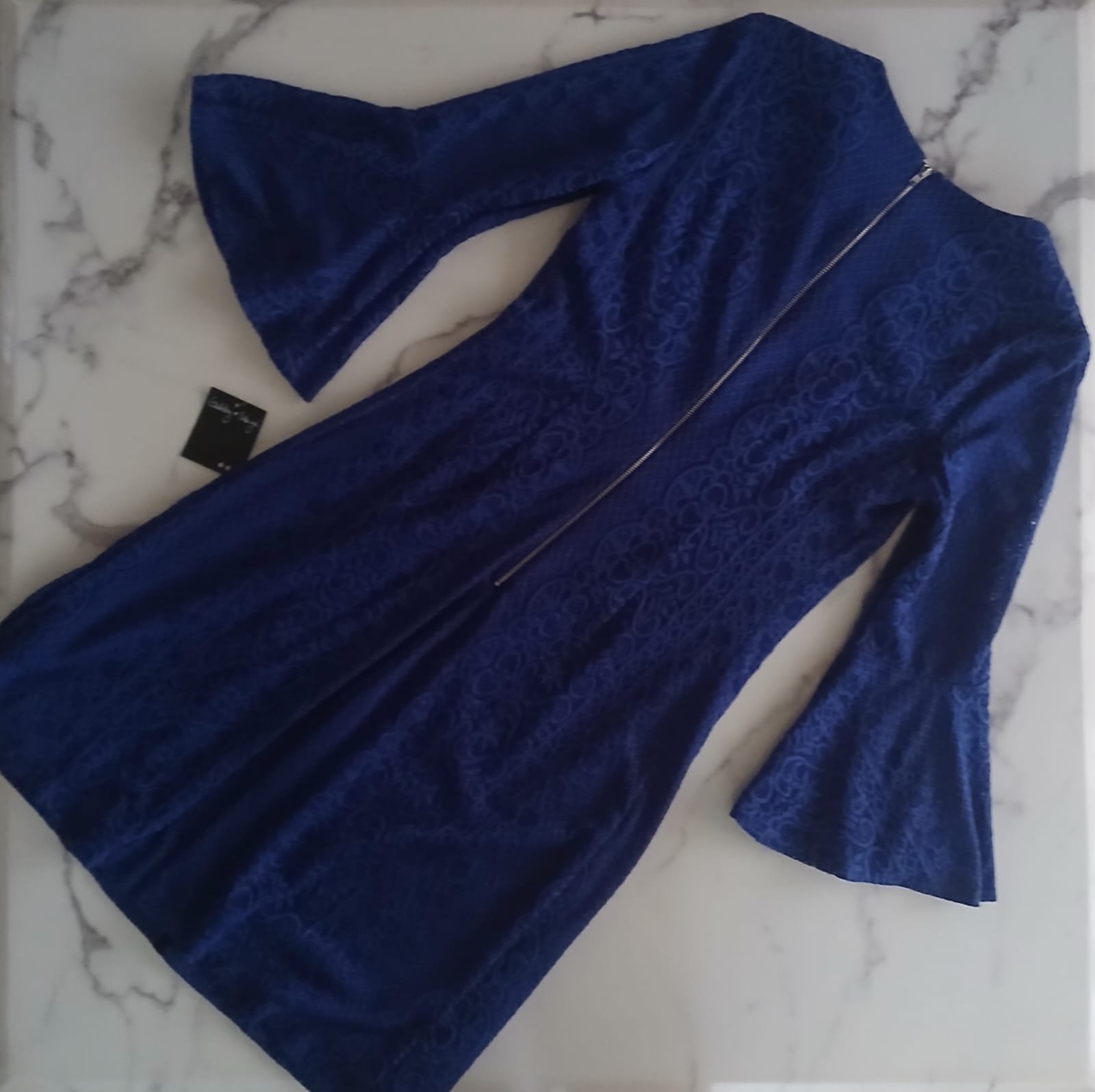 Diseño: Manga larga con estilo acampanado, corte ajustado al cuerpo, cierre de cremallera en la parte trasera