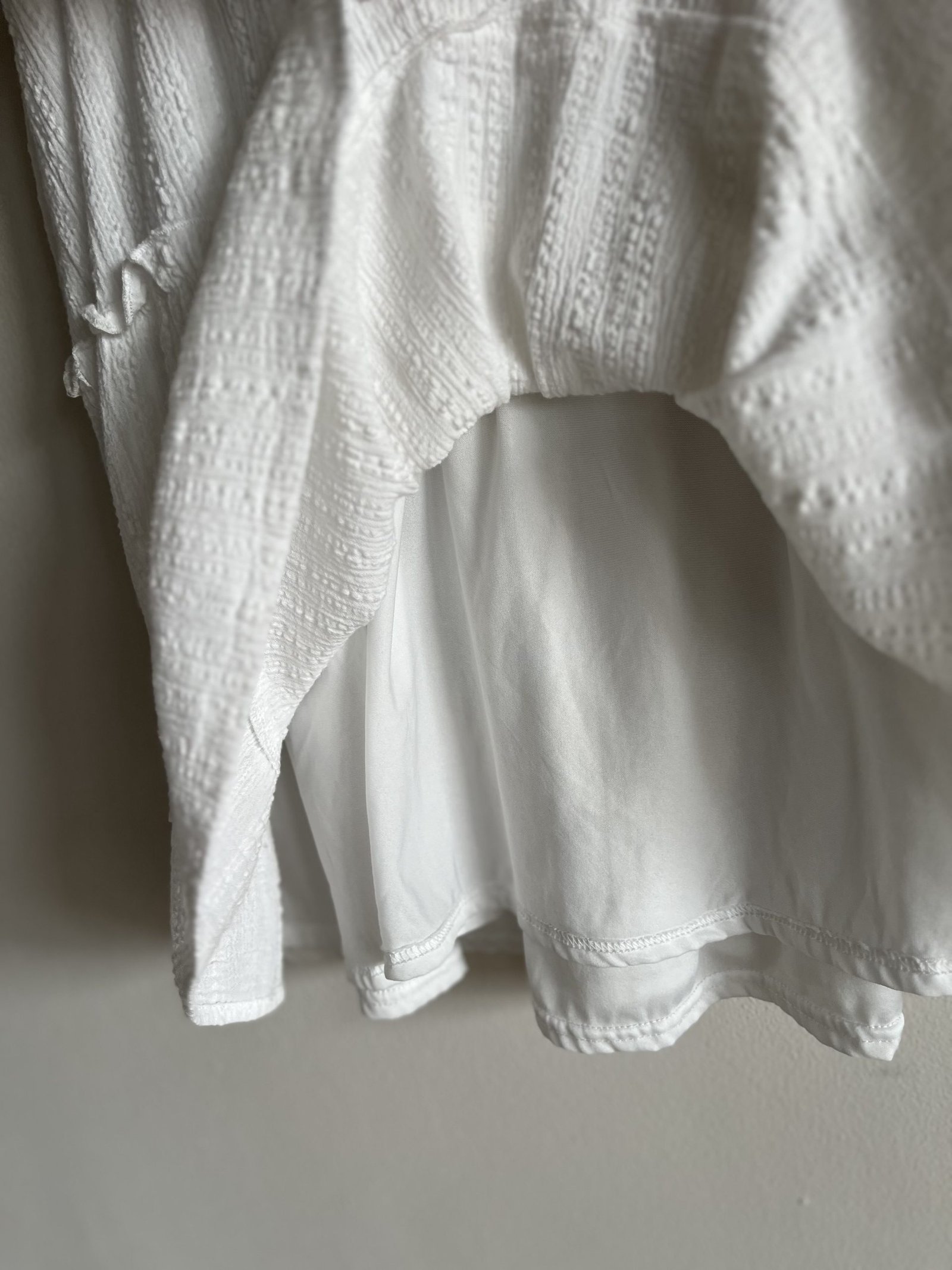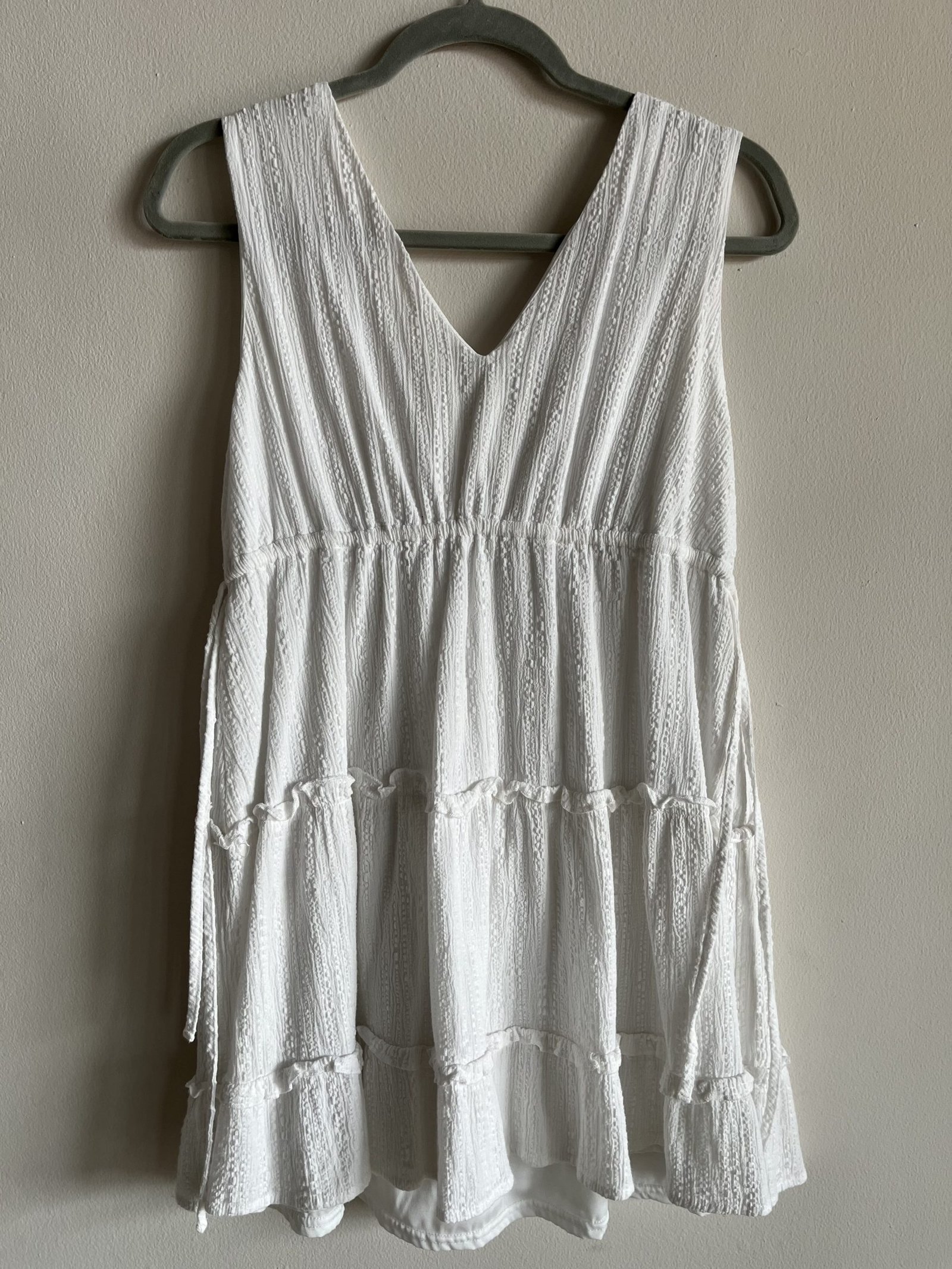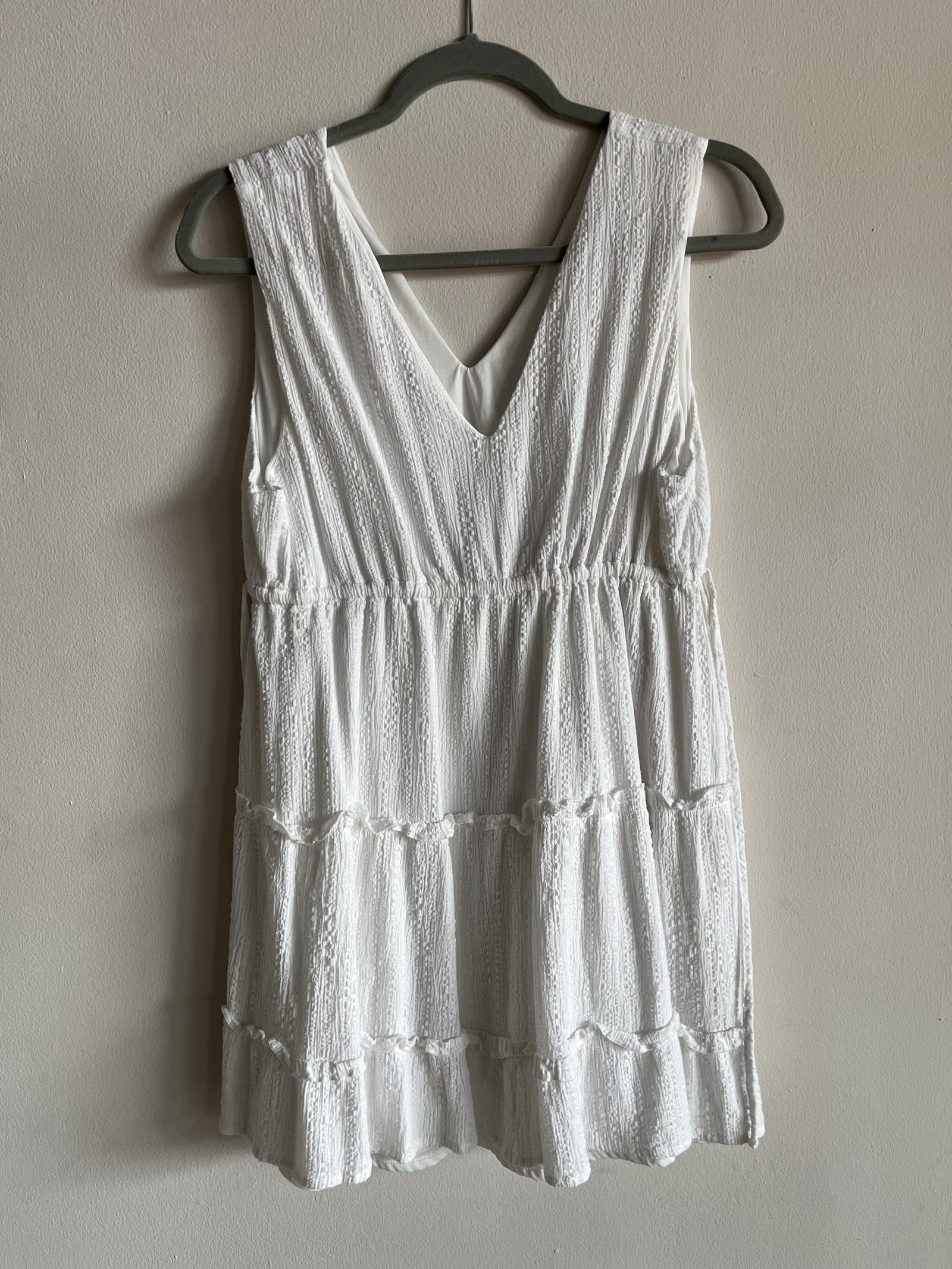 Vestido blanco, casual, corto, sin mangas, cuello en V, con cintas ajustables a ambos lados de la cintura, totalmente forrado. Tela fresca y no requiere plancharse. Poco uso. En muy buen estado! Talla L, pero corre M.