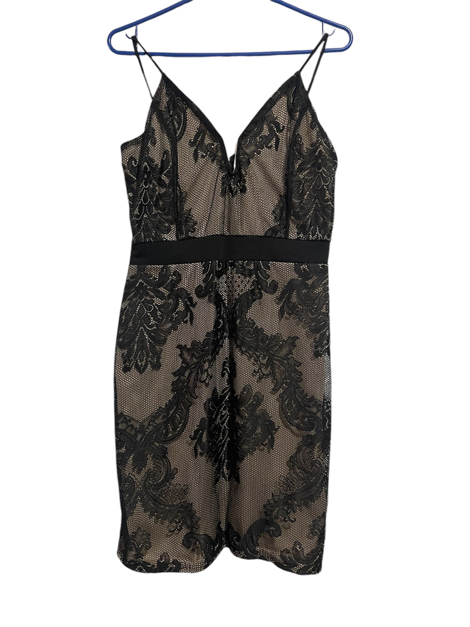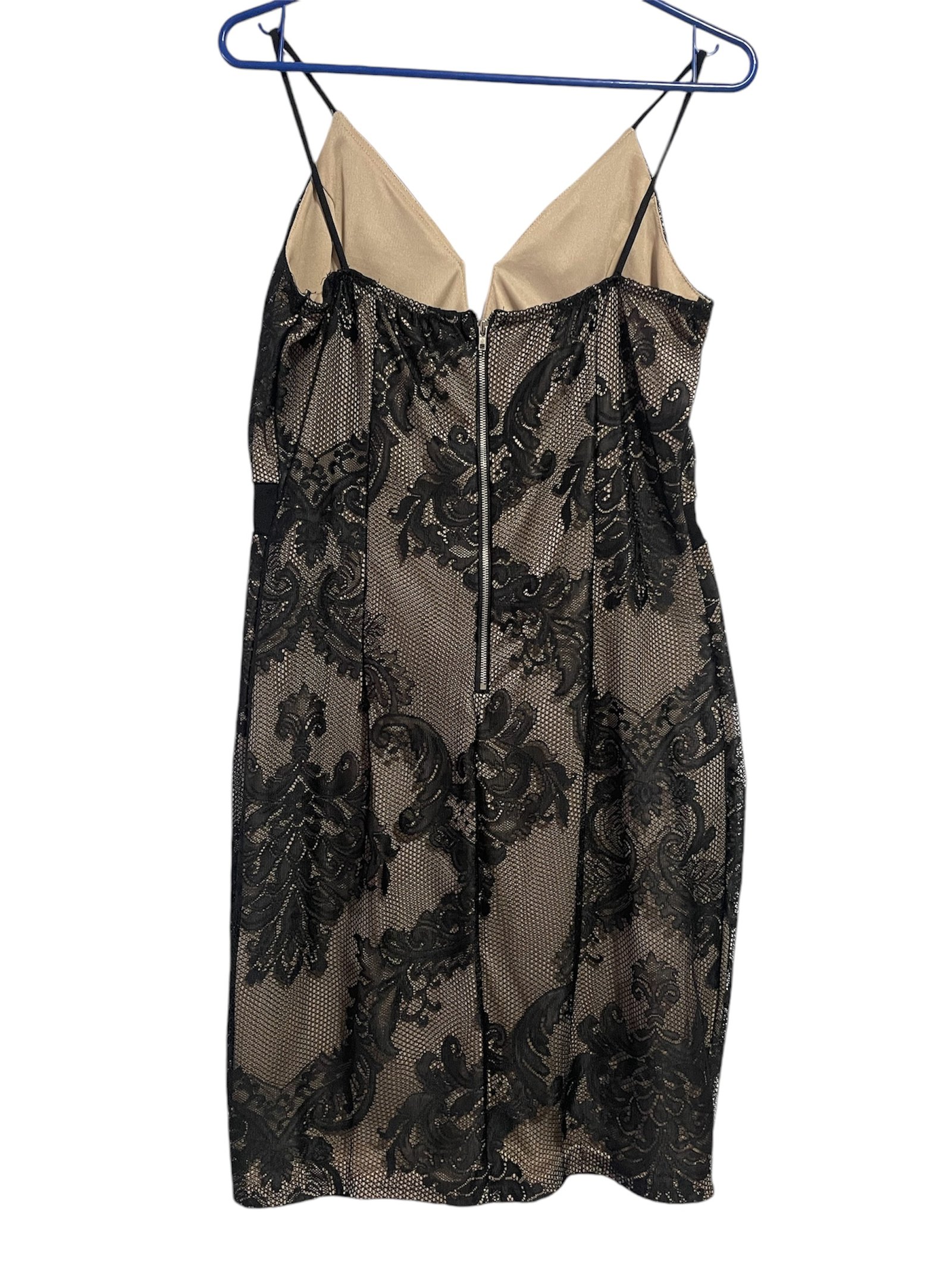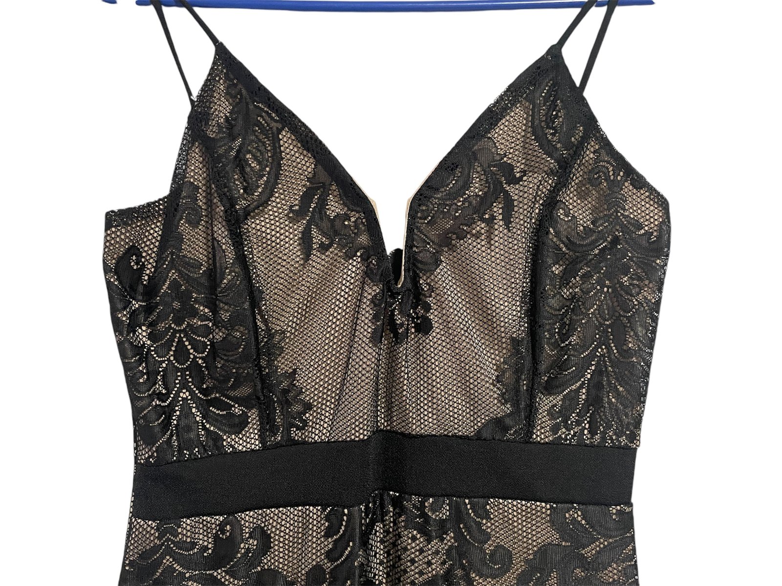 Hermoso vestido coctel corto de encaje negro con fondo color piel, tela fresca y estira.