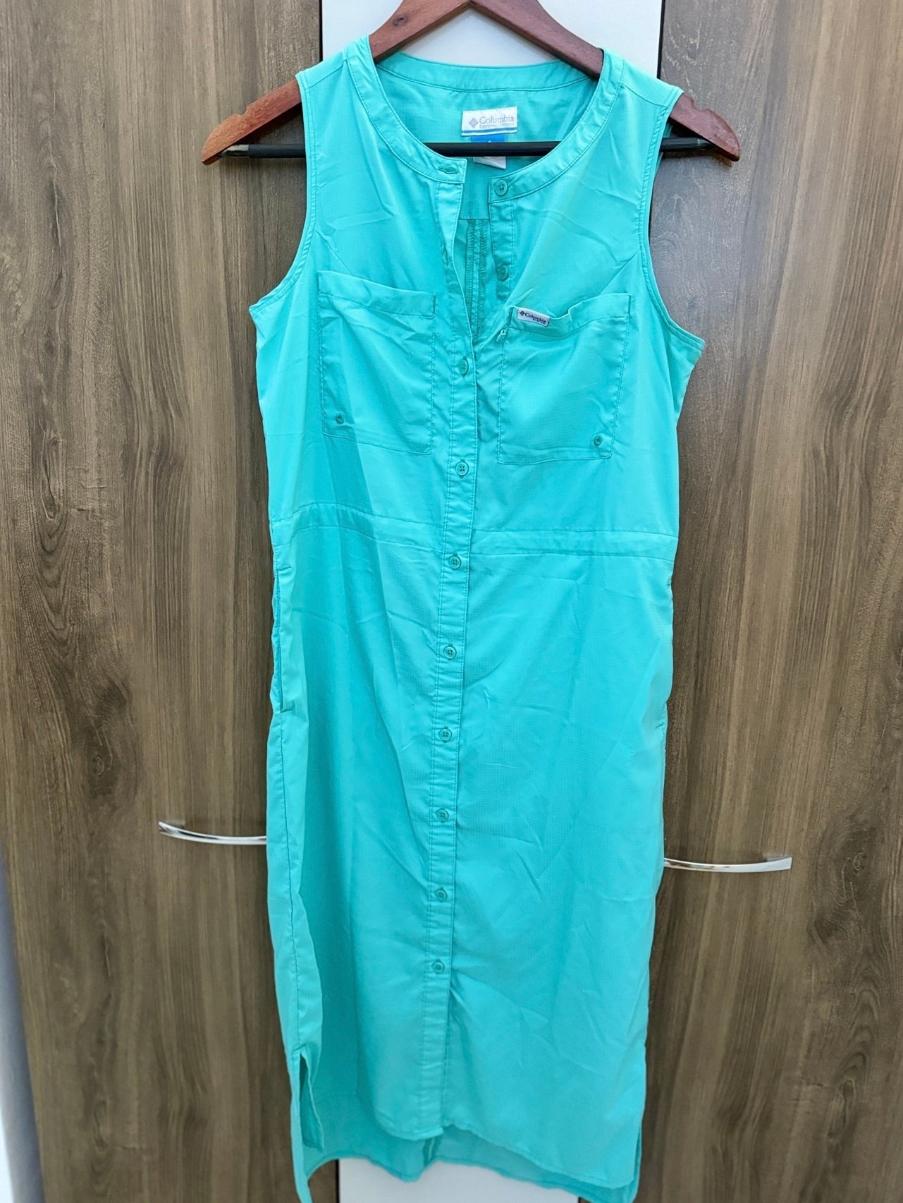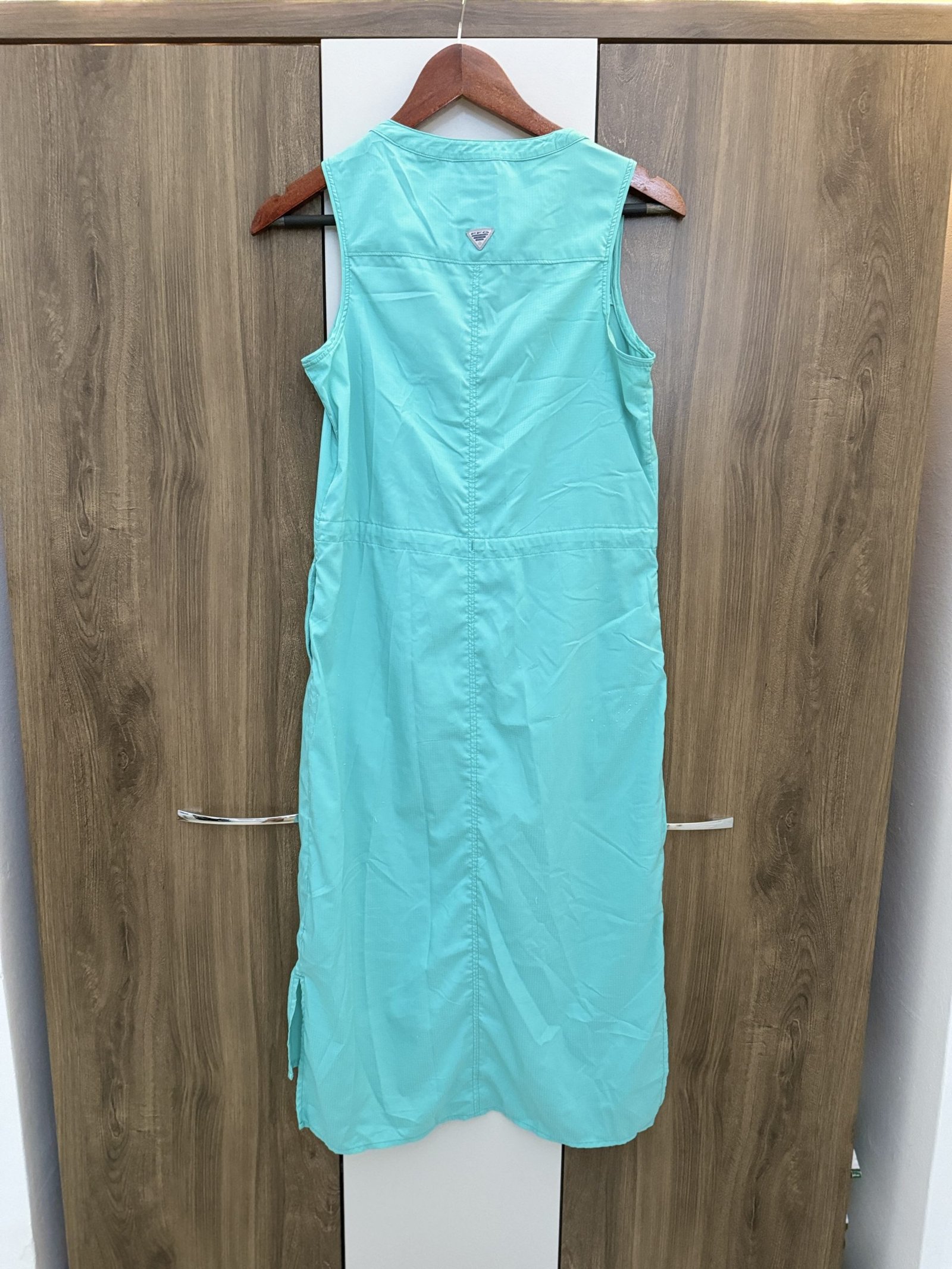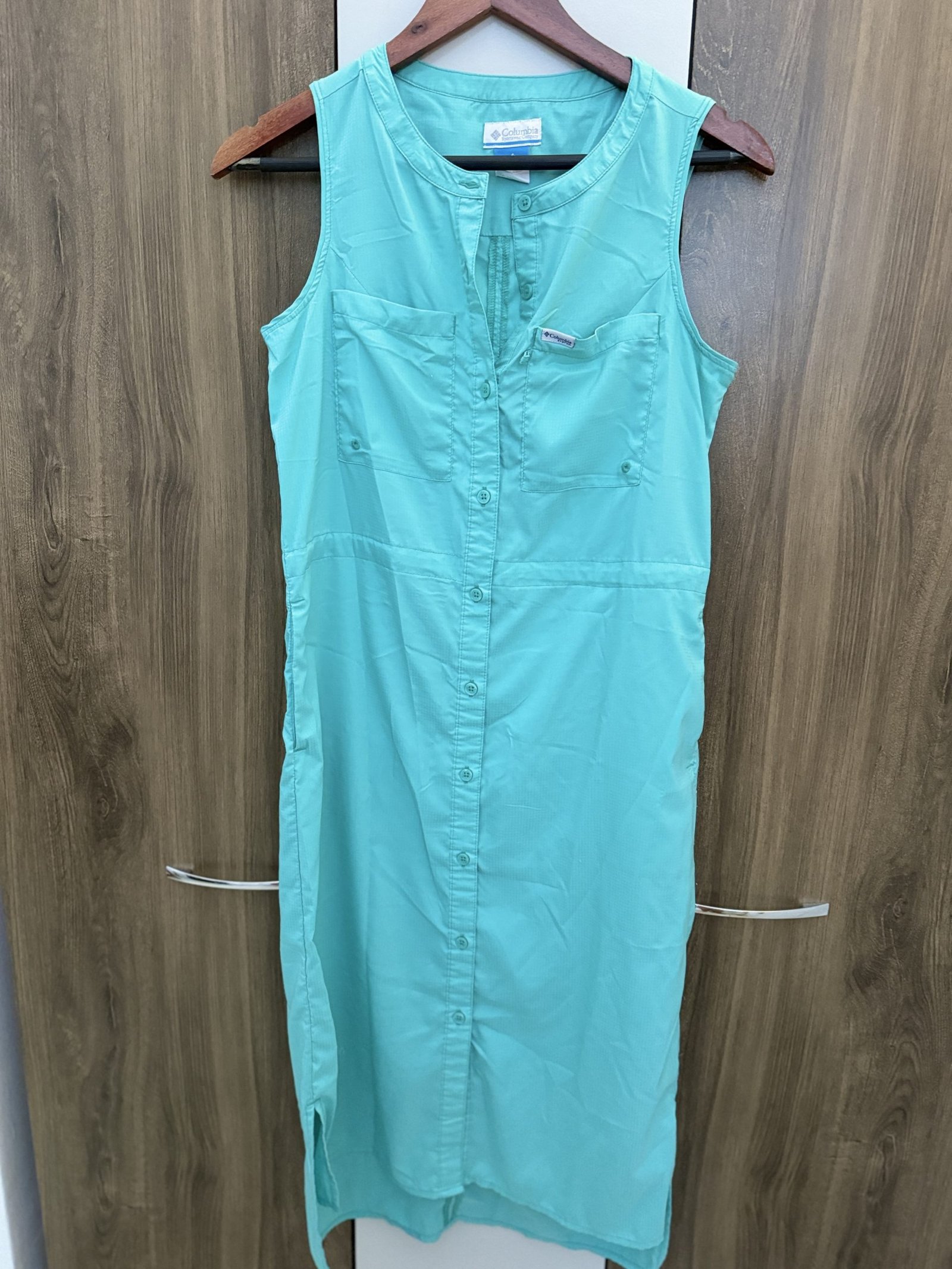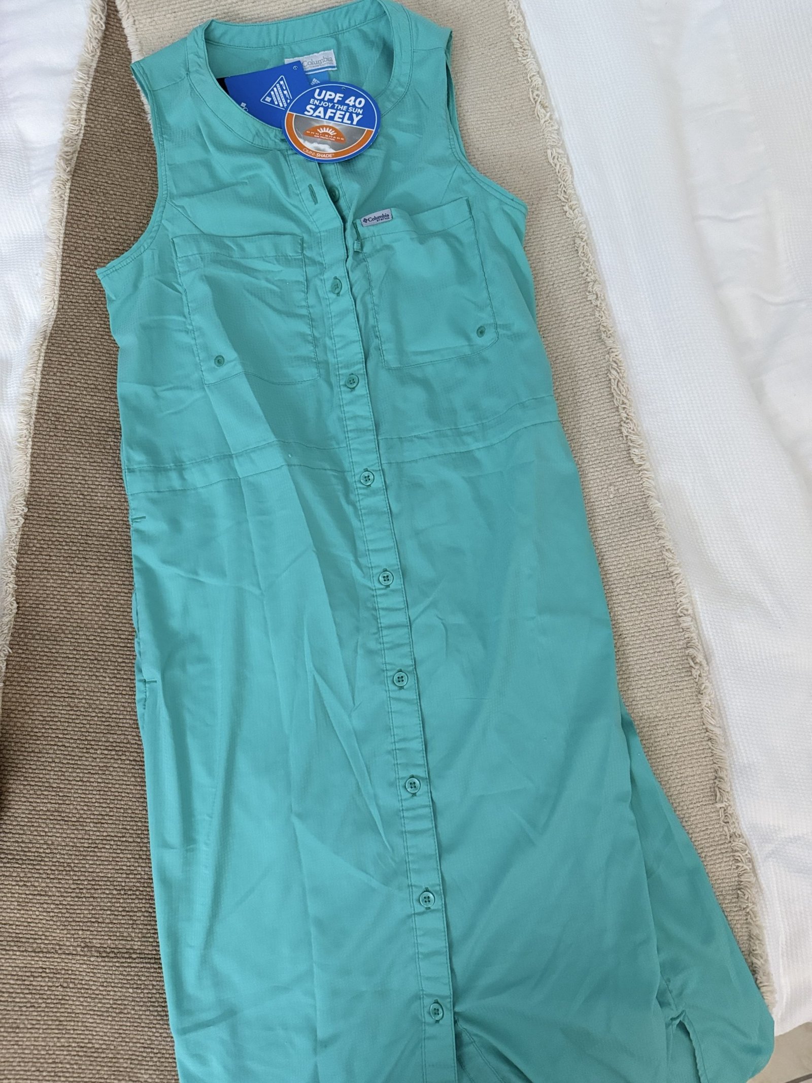 Vestido tipo camisero de la marca Columbia, perfecto para días soleados o actividades al aire libre. Con protección solar UPF 40, es ideal para mantenerte fresca y protegida. Tiene un diseño sin mangas, botones frontales y bolsillos funcionales le dan un toque casual y cómodo. Solo un uso.