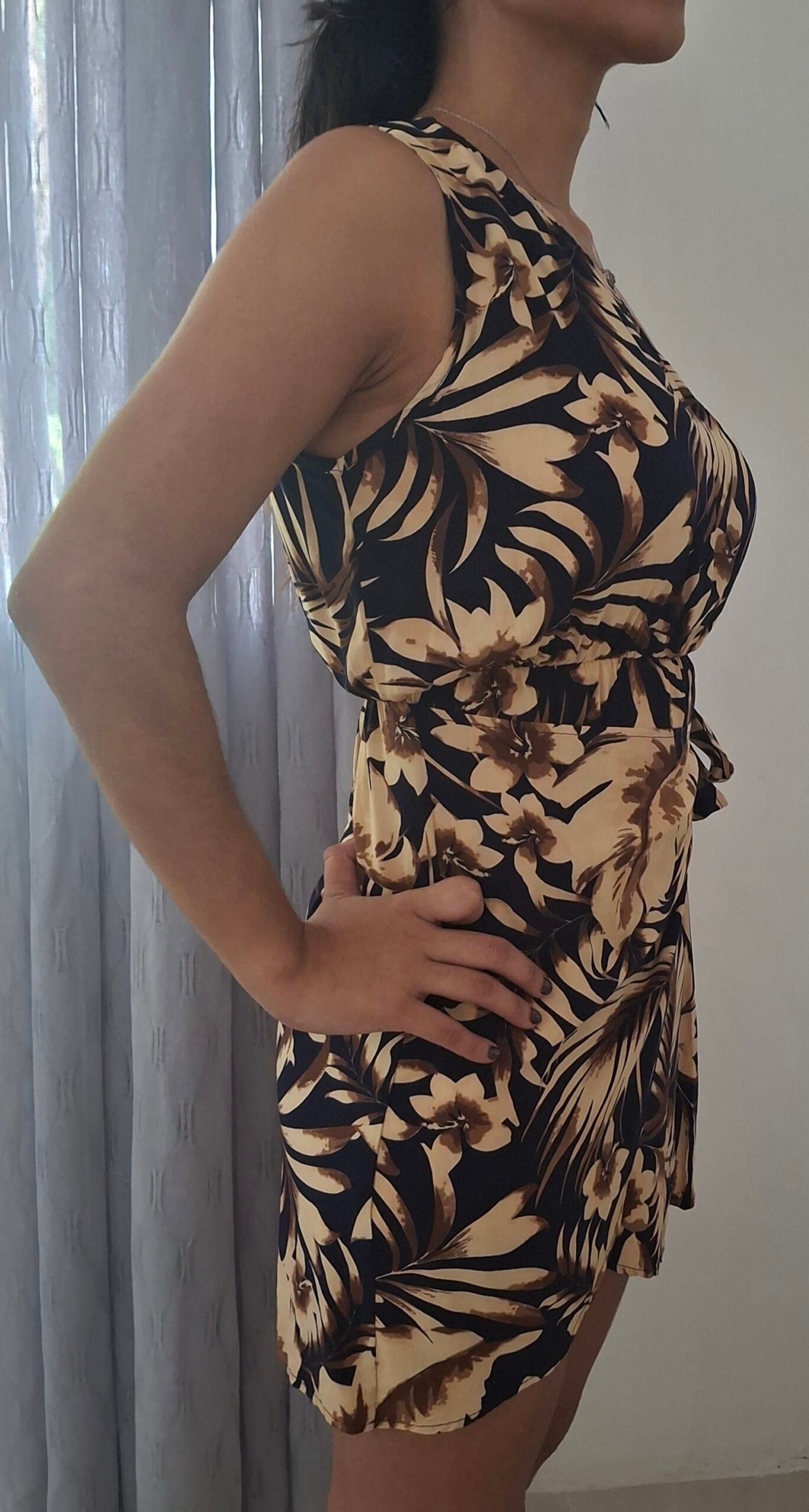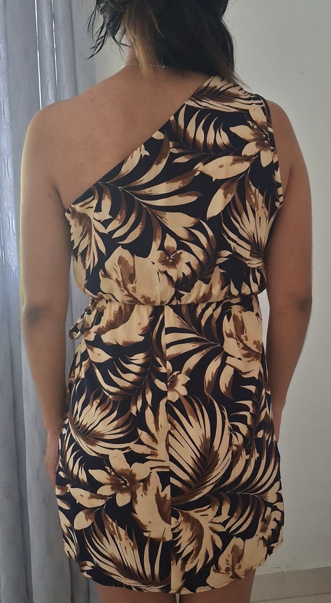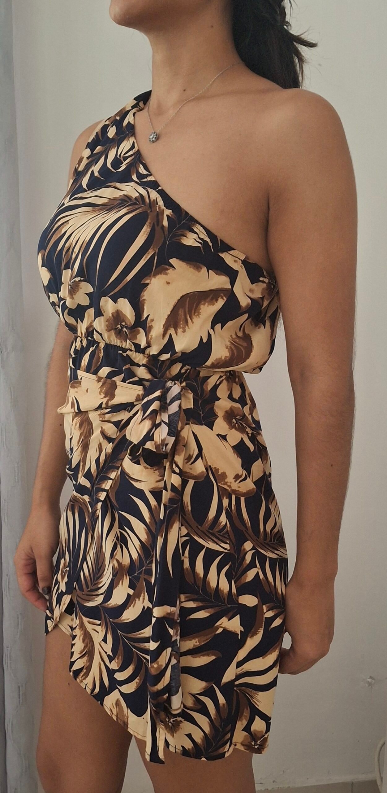 Vestidito veraniego tipo one shoulder con estampados.