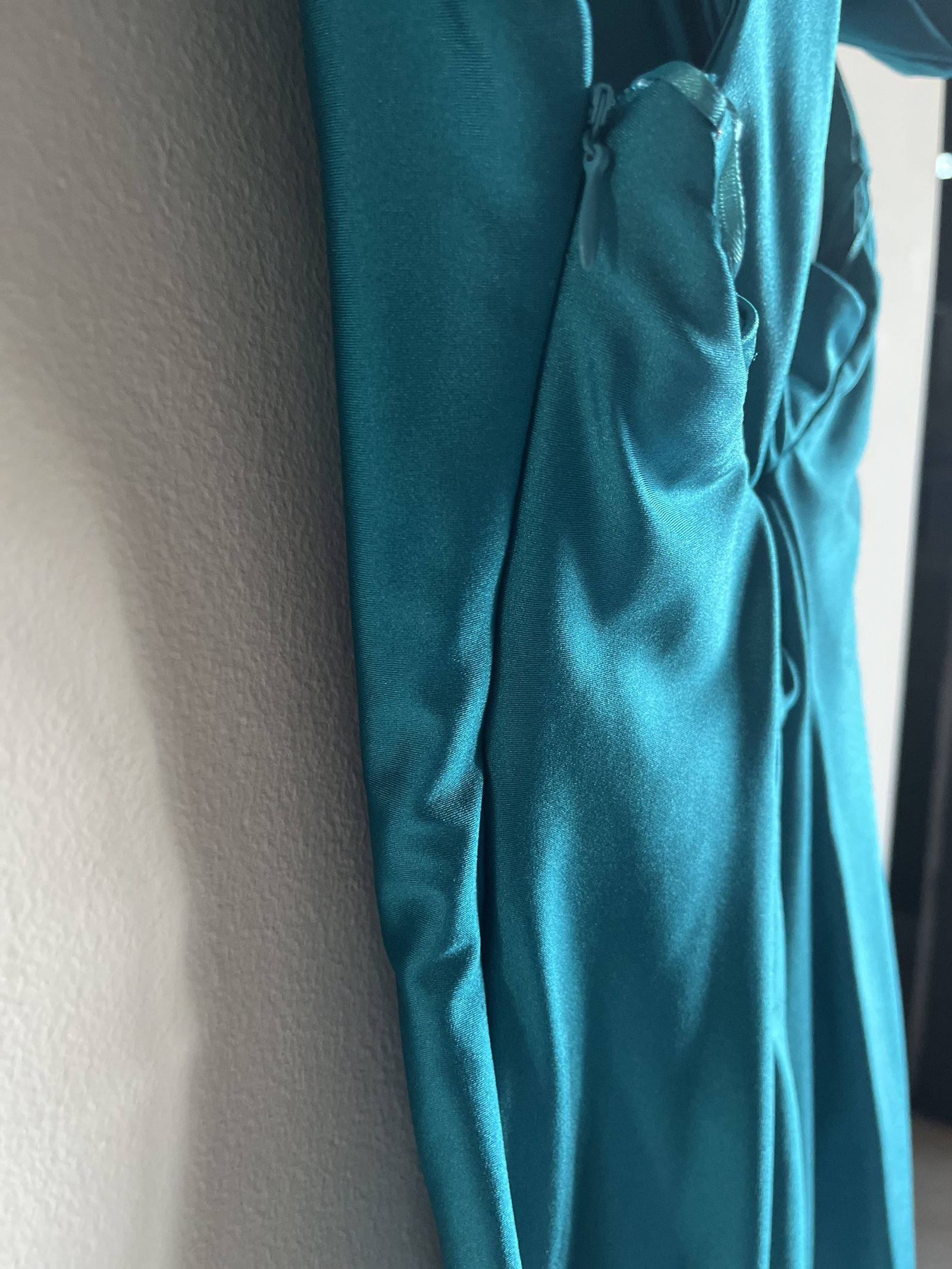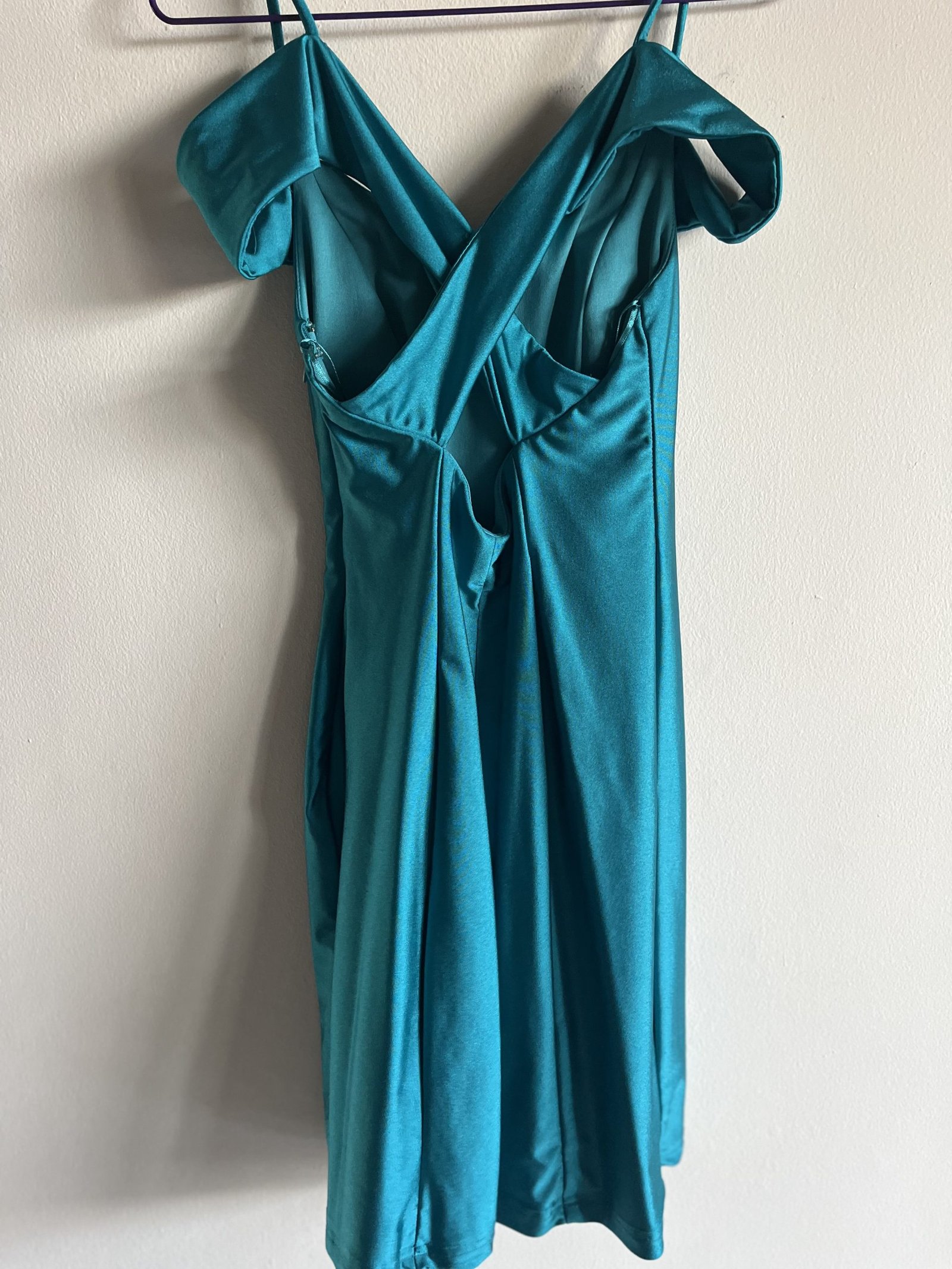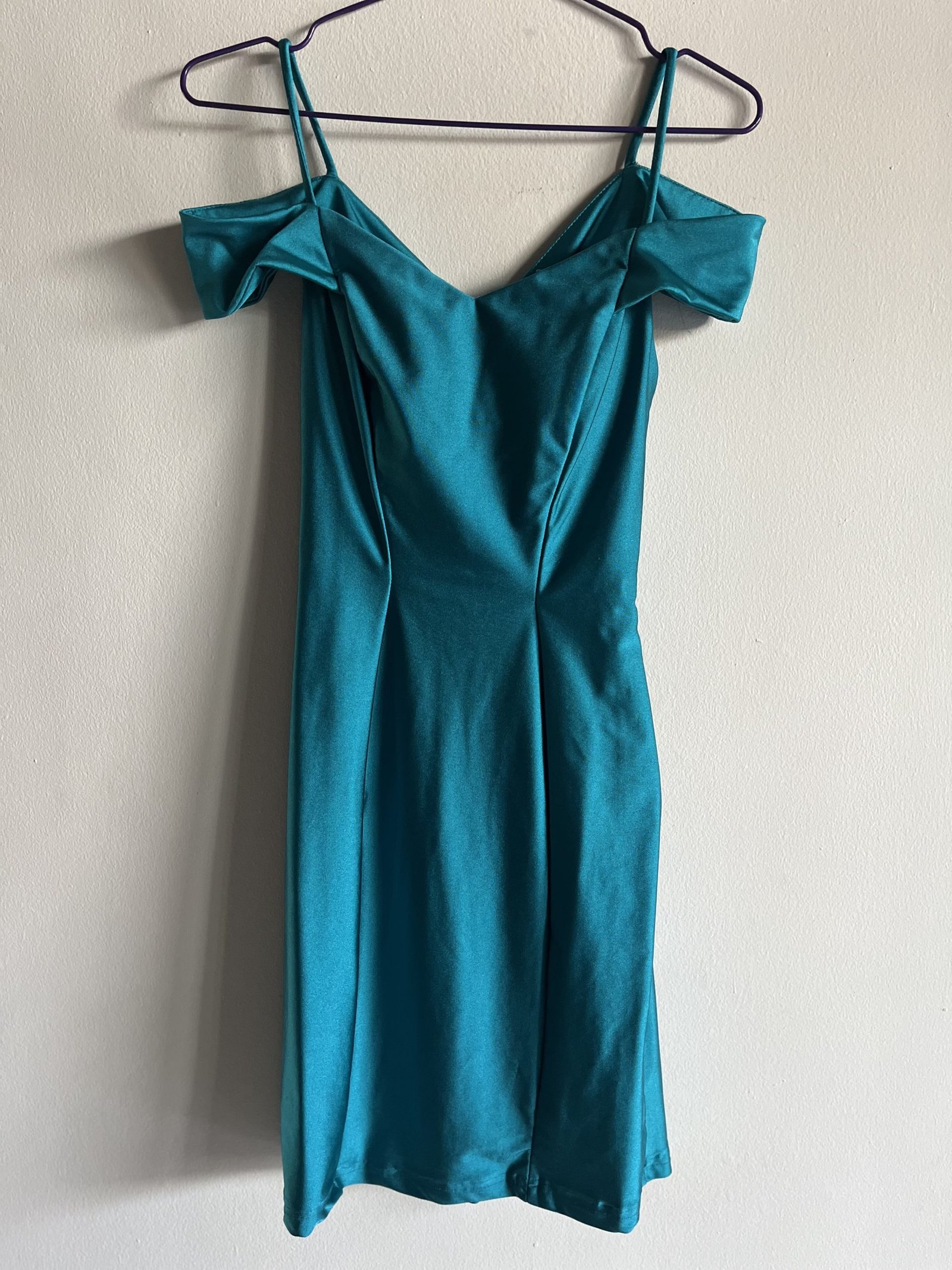 Sexy y elegante Vestido Cocktail estilo hombros descubiertos y espalda cruzada. Con tela satinada que se ajusta a la figura y un hermoso color especial para cualquier tipo de festejo. Tiene zipper a un costado. Como nuevo. Talla 1 pero fue ajustado a talla 0.