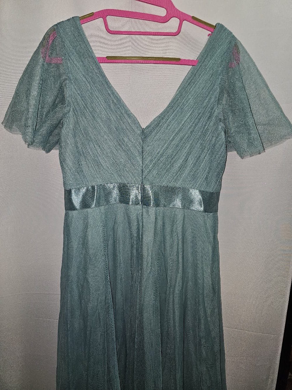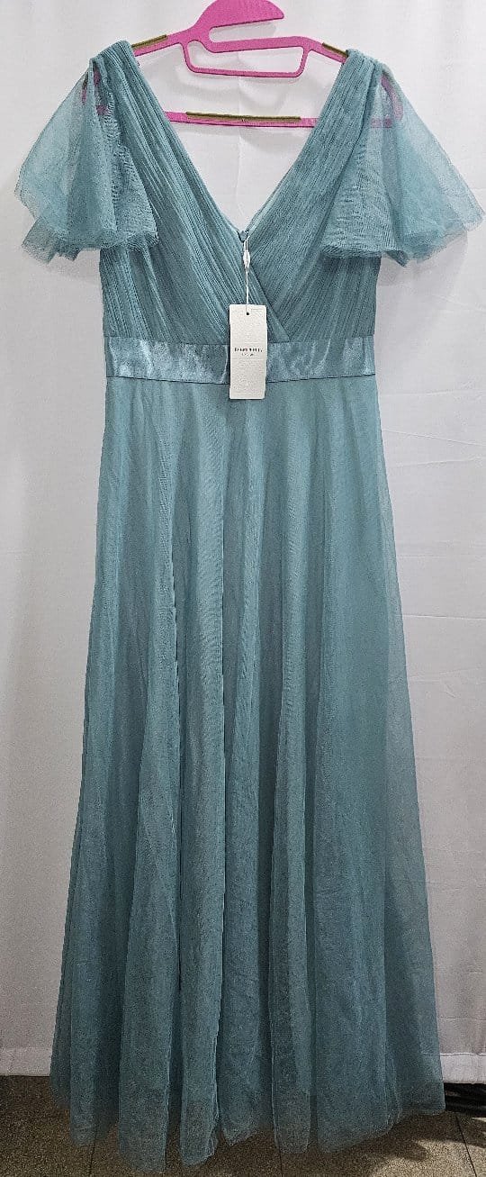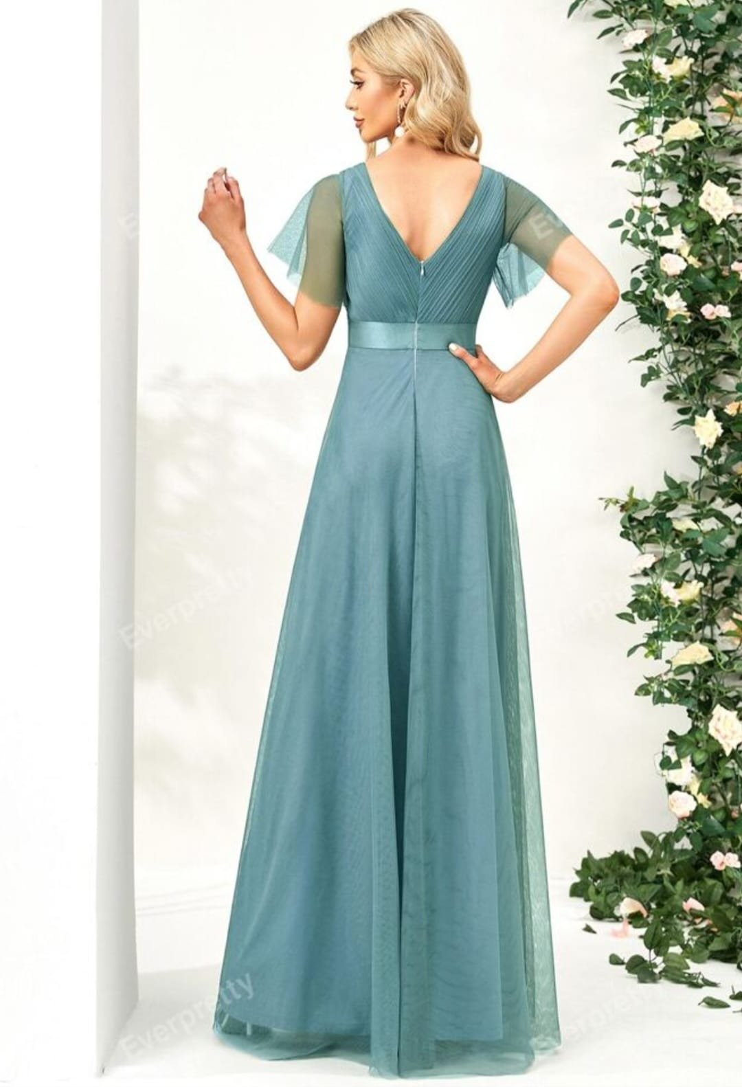 - Detalles: Escote en V, mangas cortas tipo mariposa y detalle de cinta de satén en la cintura para estilizar la figura. Falda larga de tul con caída fluida.