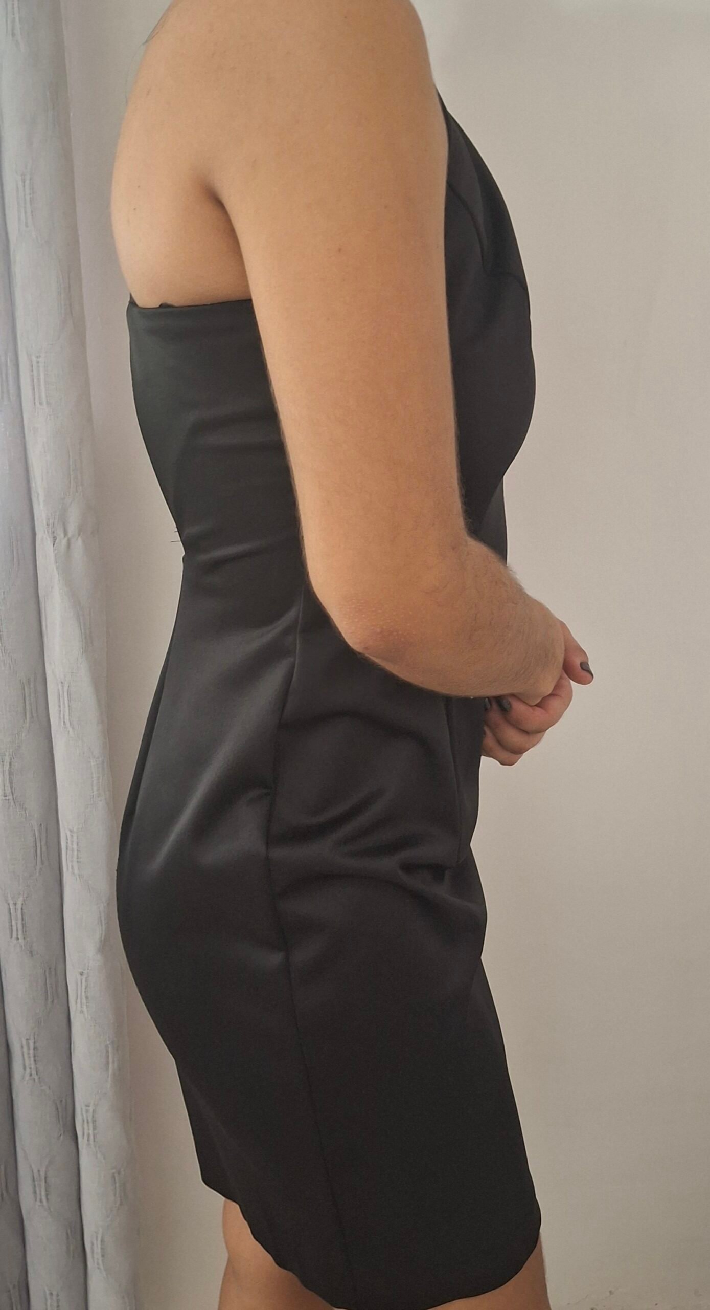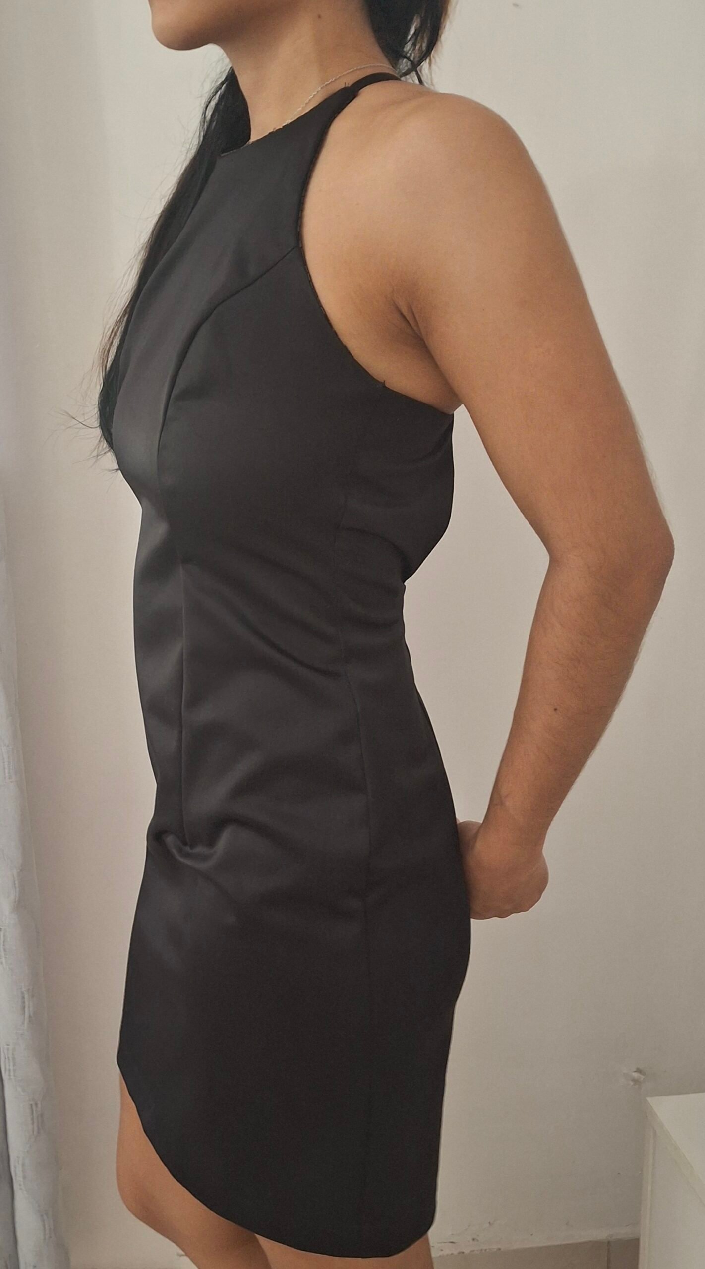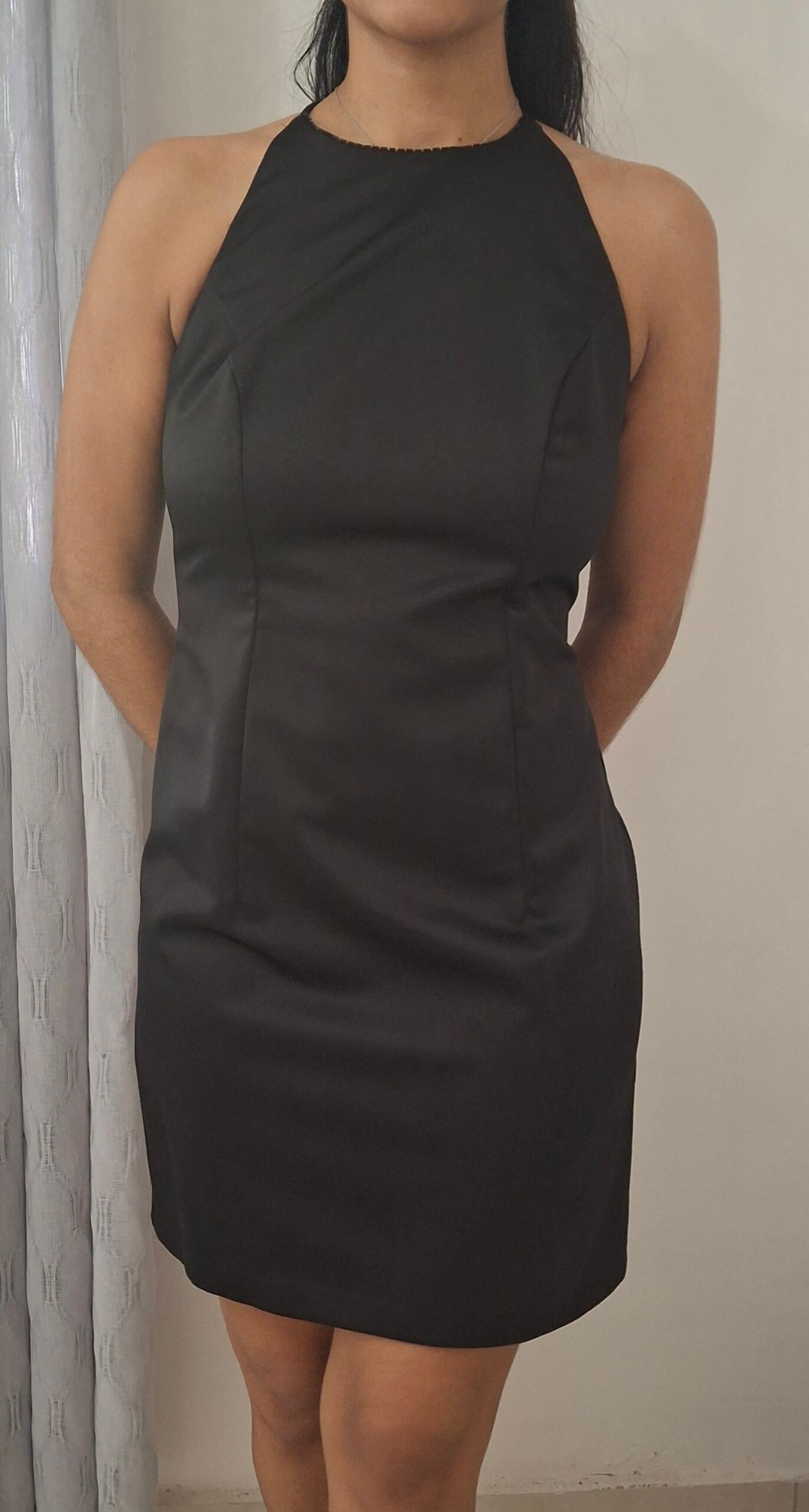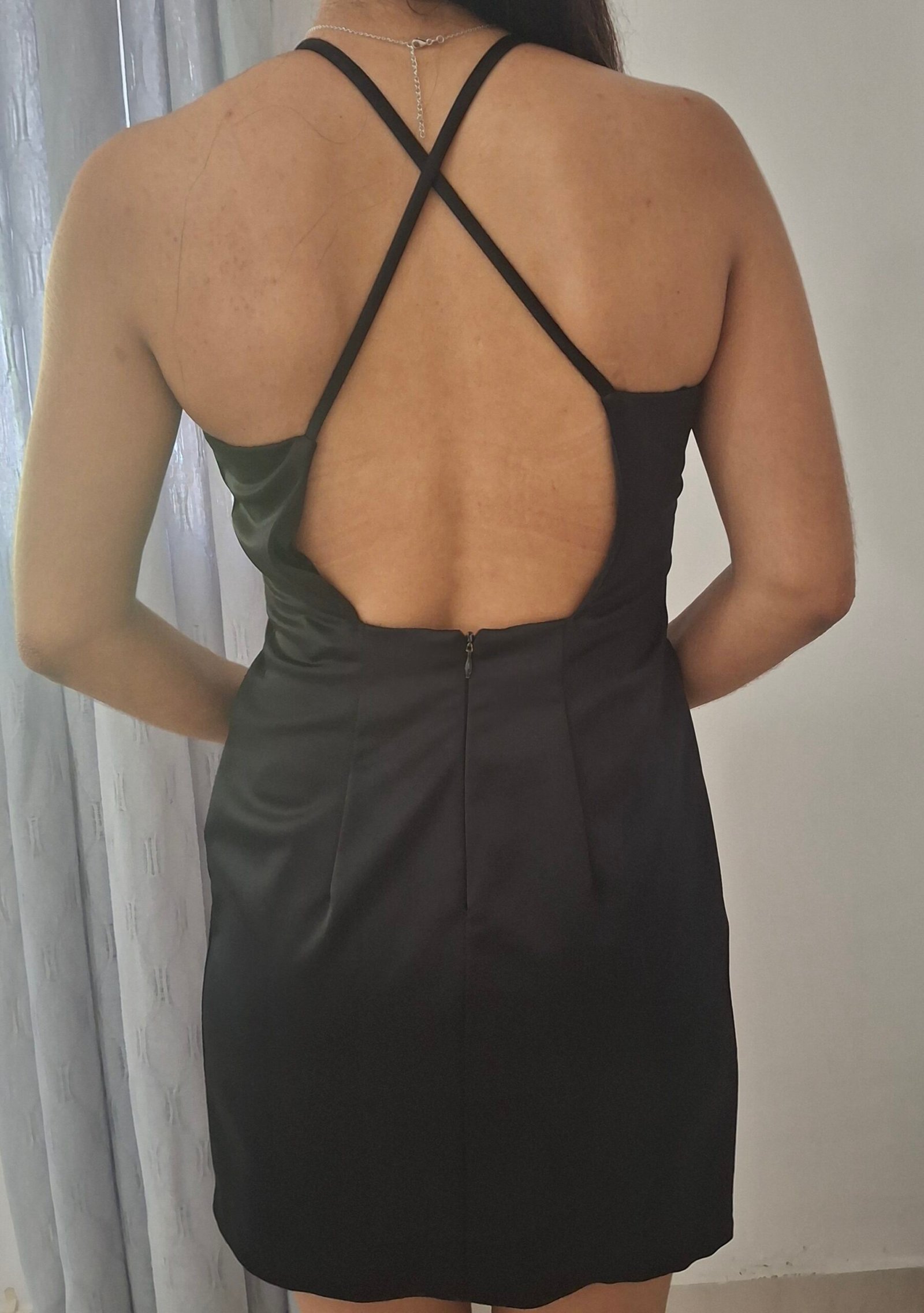 Vestido corto ideal para cocktail. Espalda abierta y detalles decorativos en mangas y cuello.