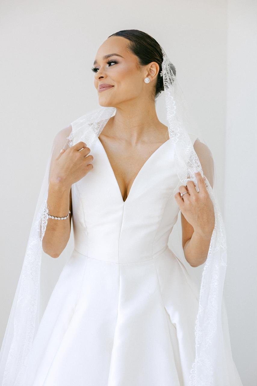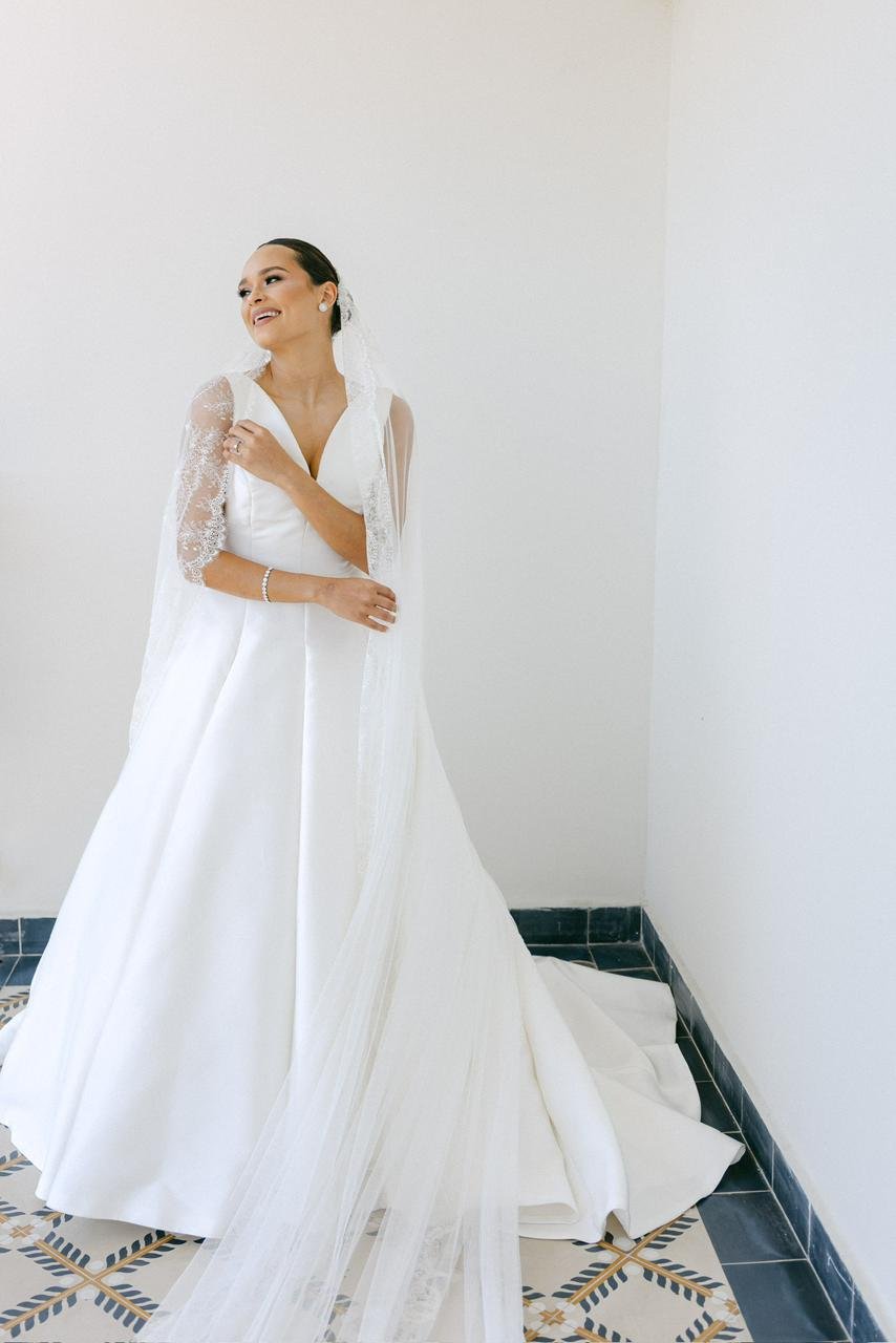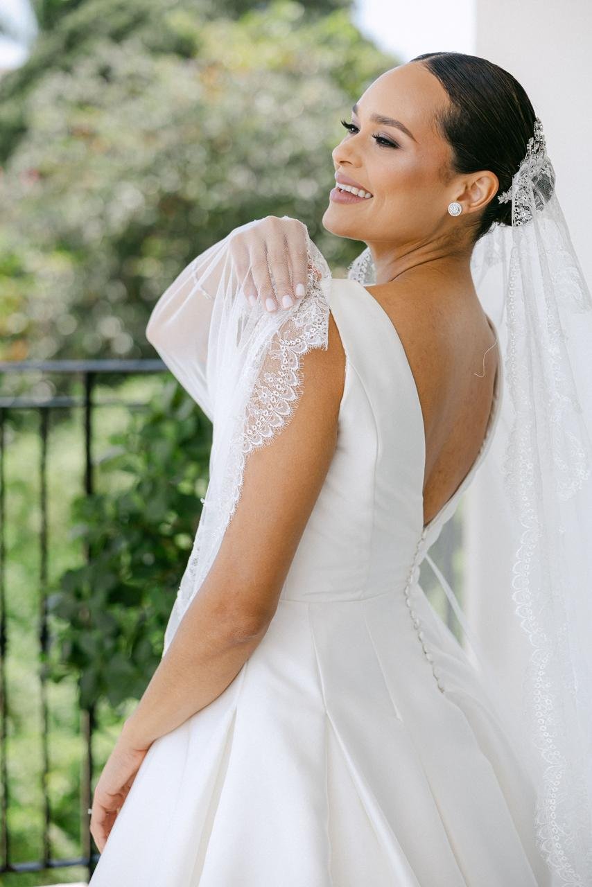 Es una pieza de alta costura que combina la elegancia clásica con un toque moderno, ideal para una novia que busca distinción y clase.