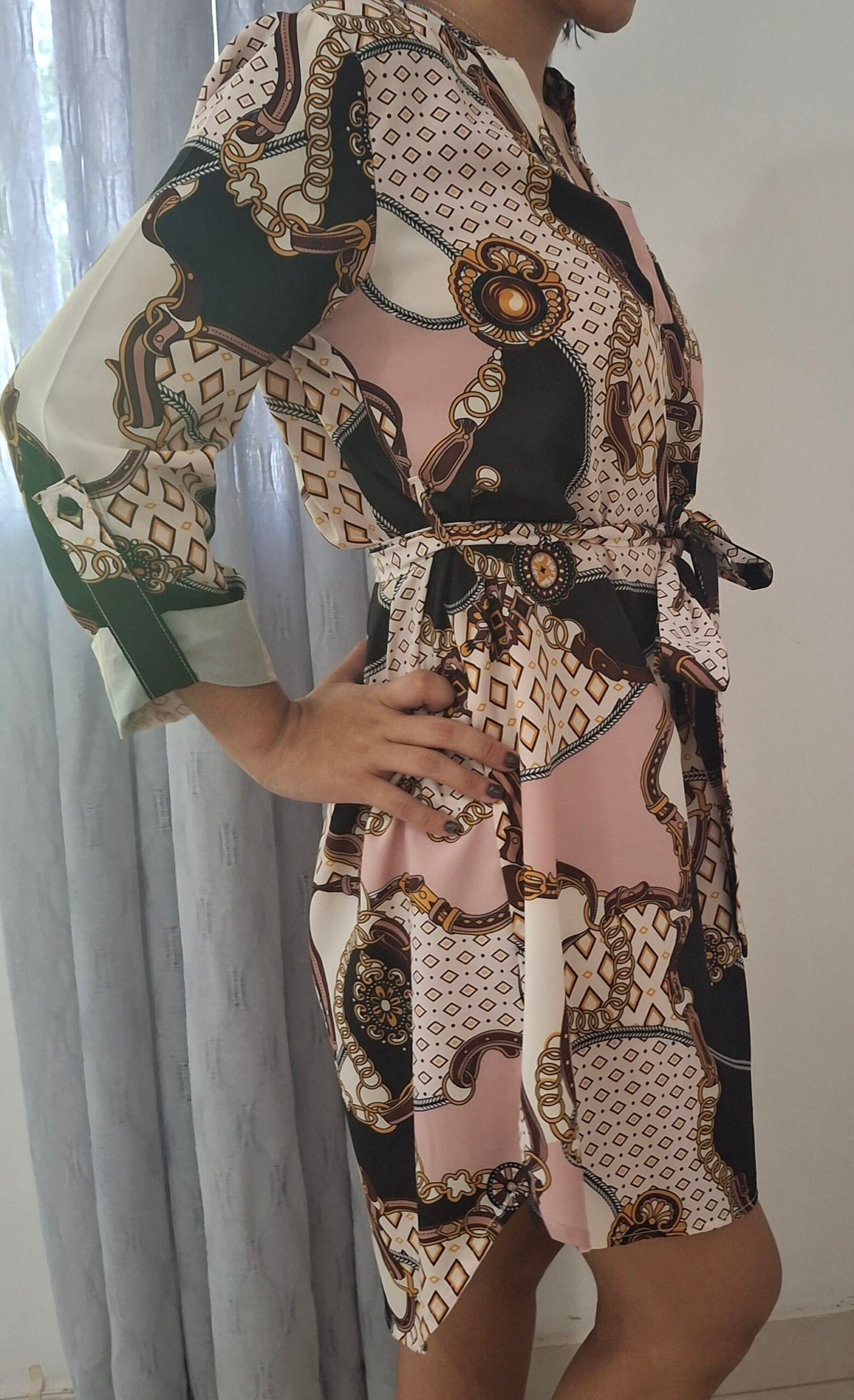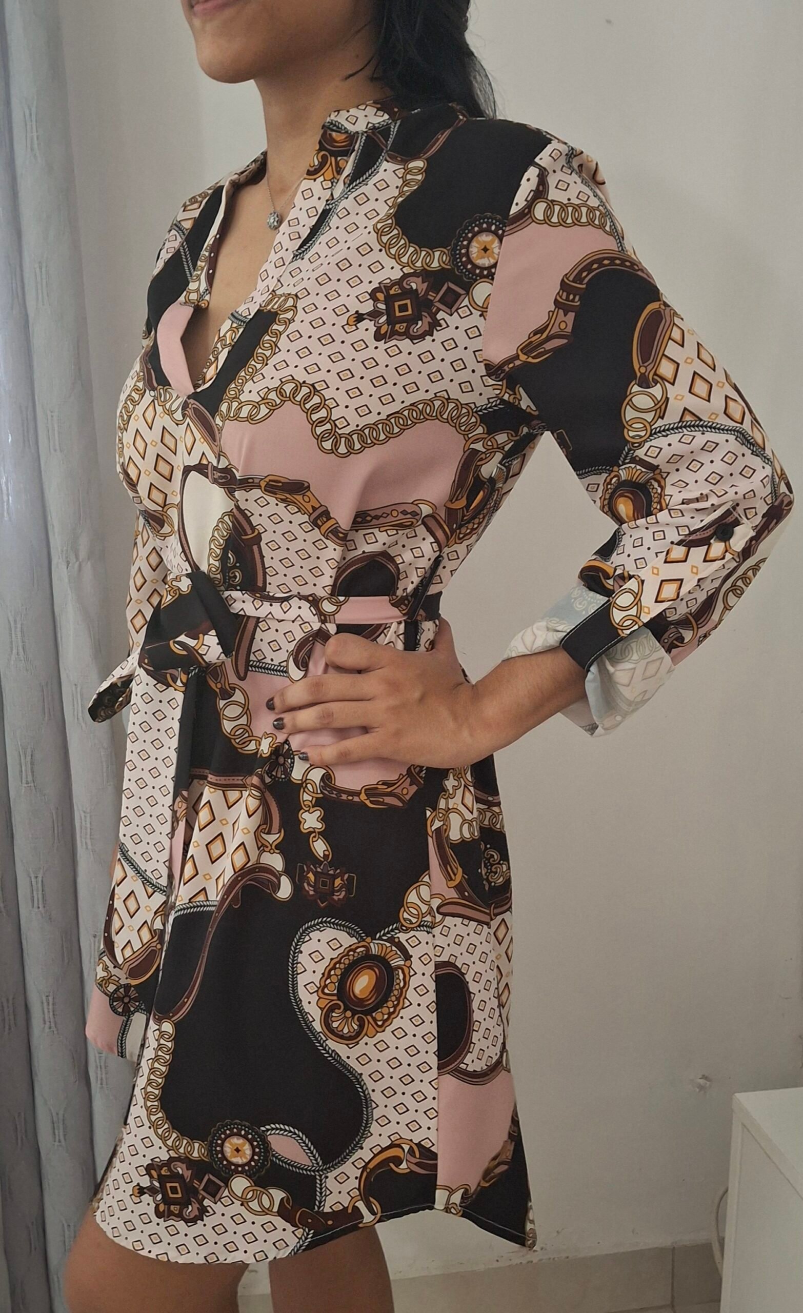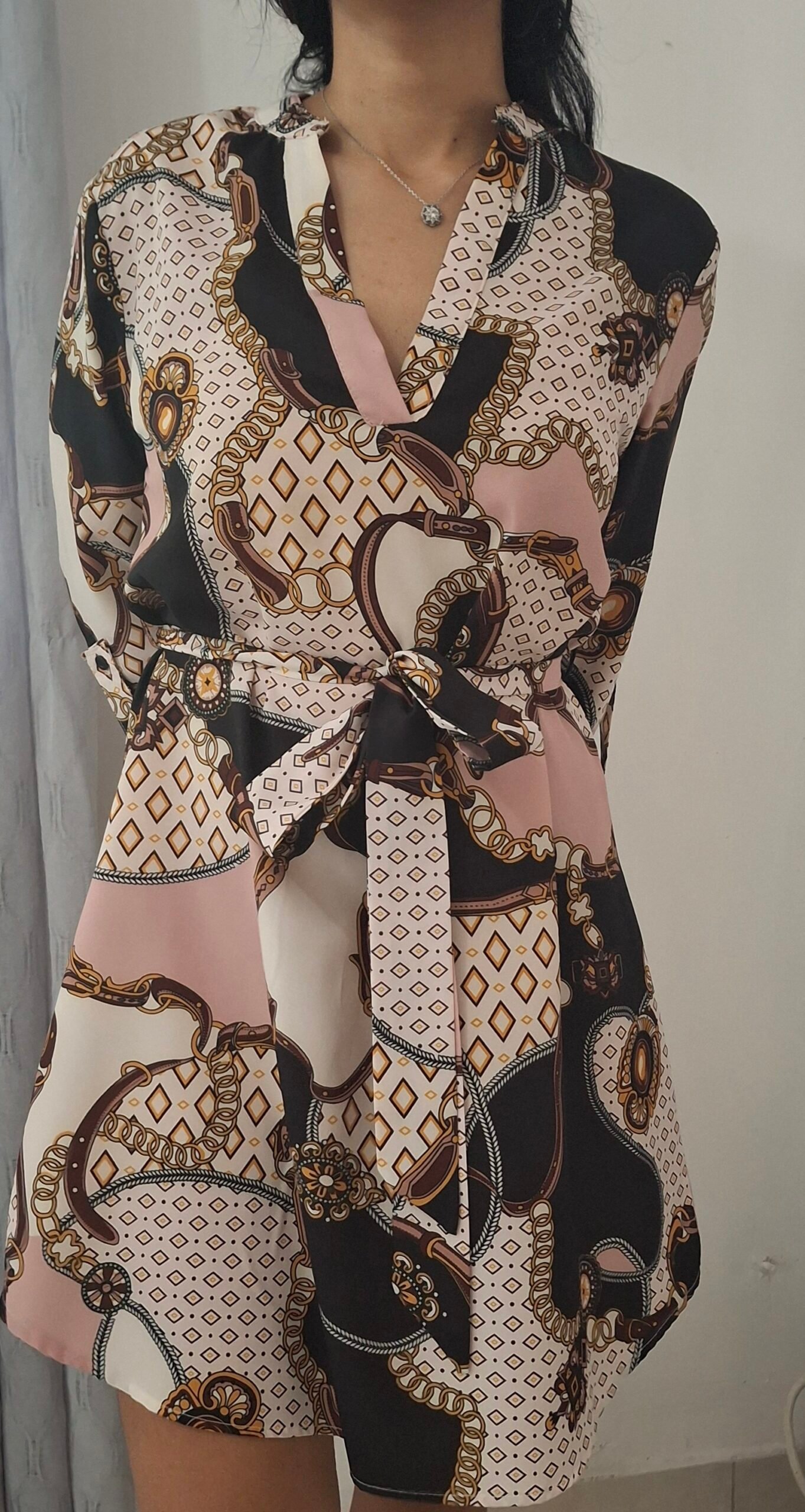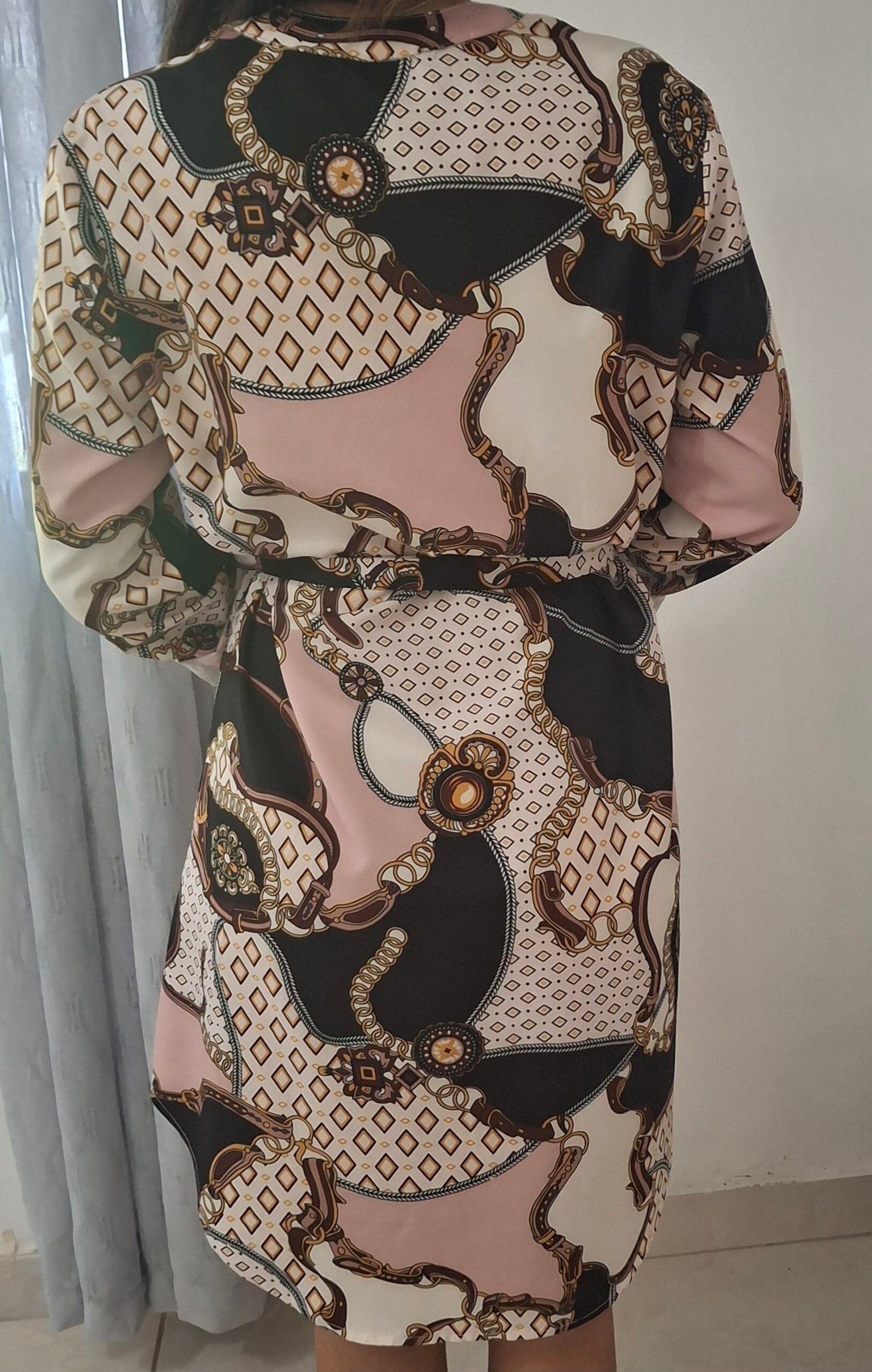 Vestido elegante manga larga con estampado de cadenas y cinturón a juego.