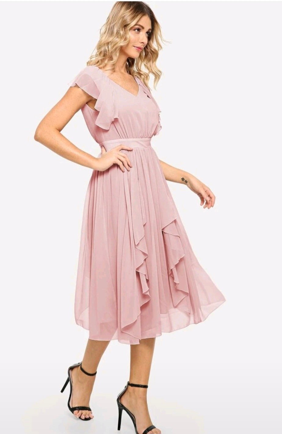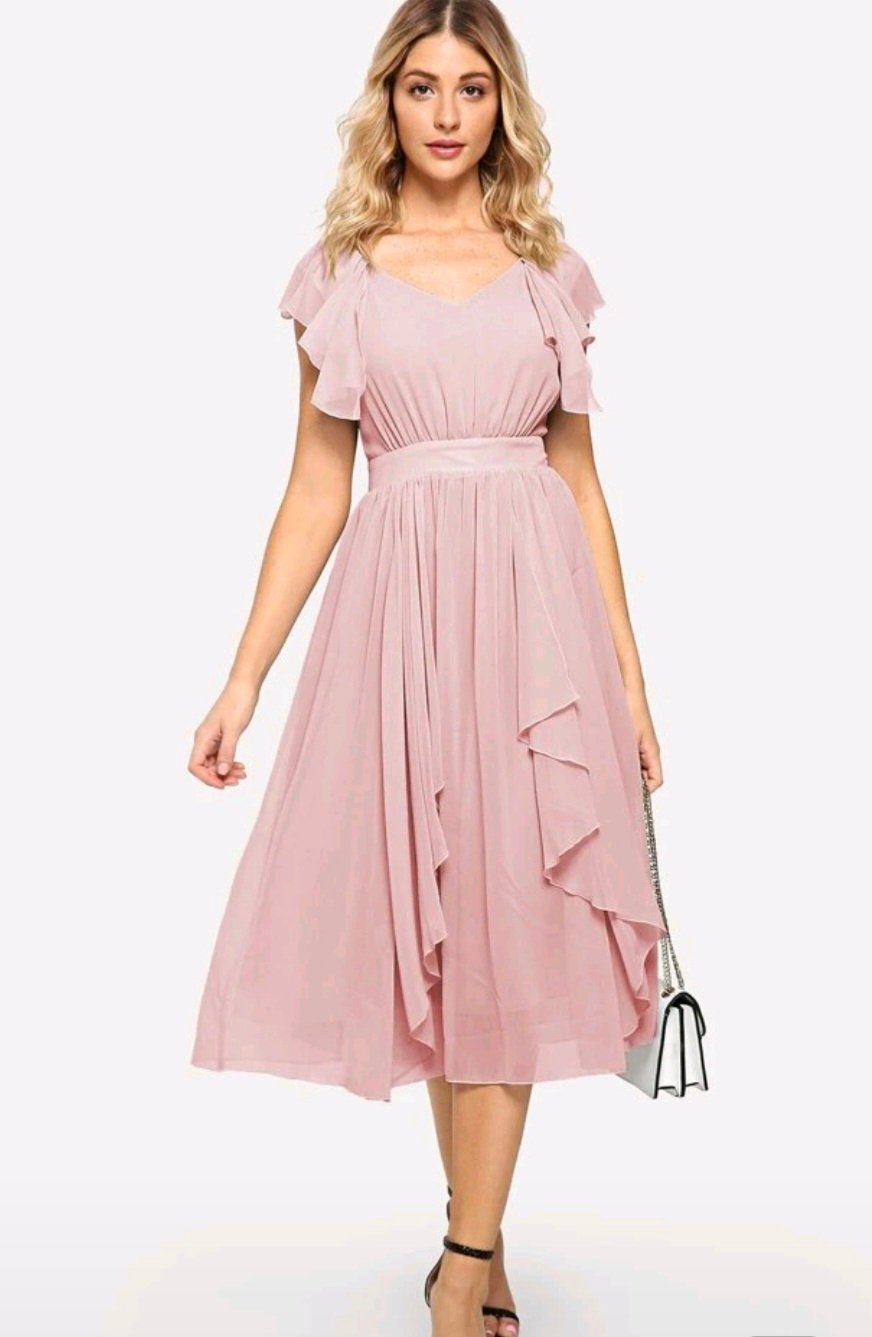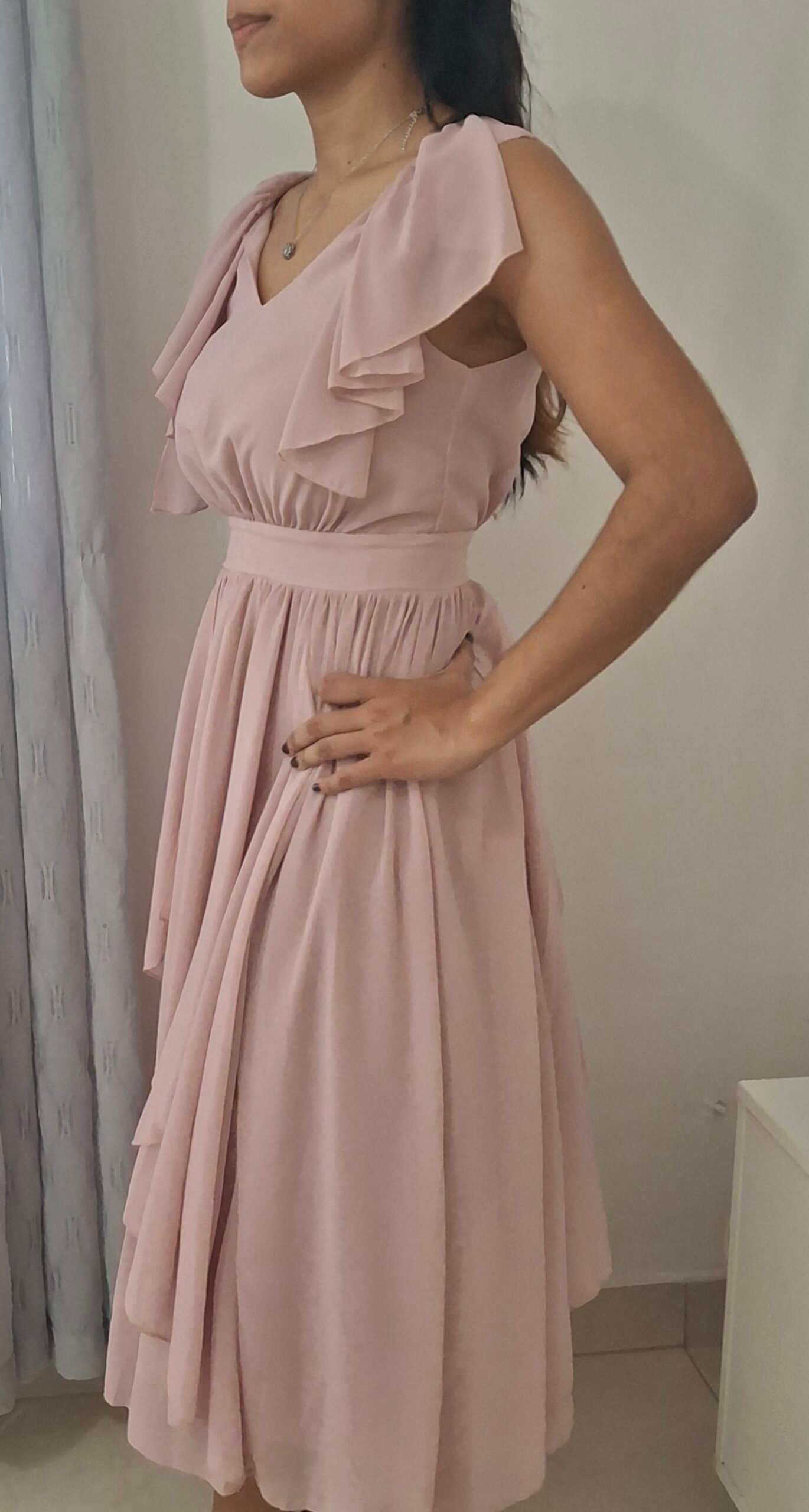 Vestido elegante tipo midi, con vuelos en las mangas y detalle en la cintura para estilizar la figura.