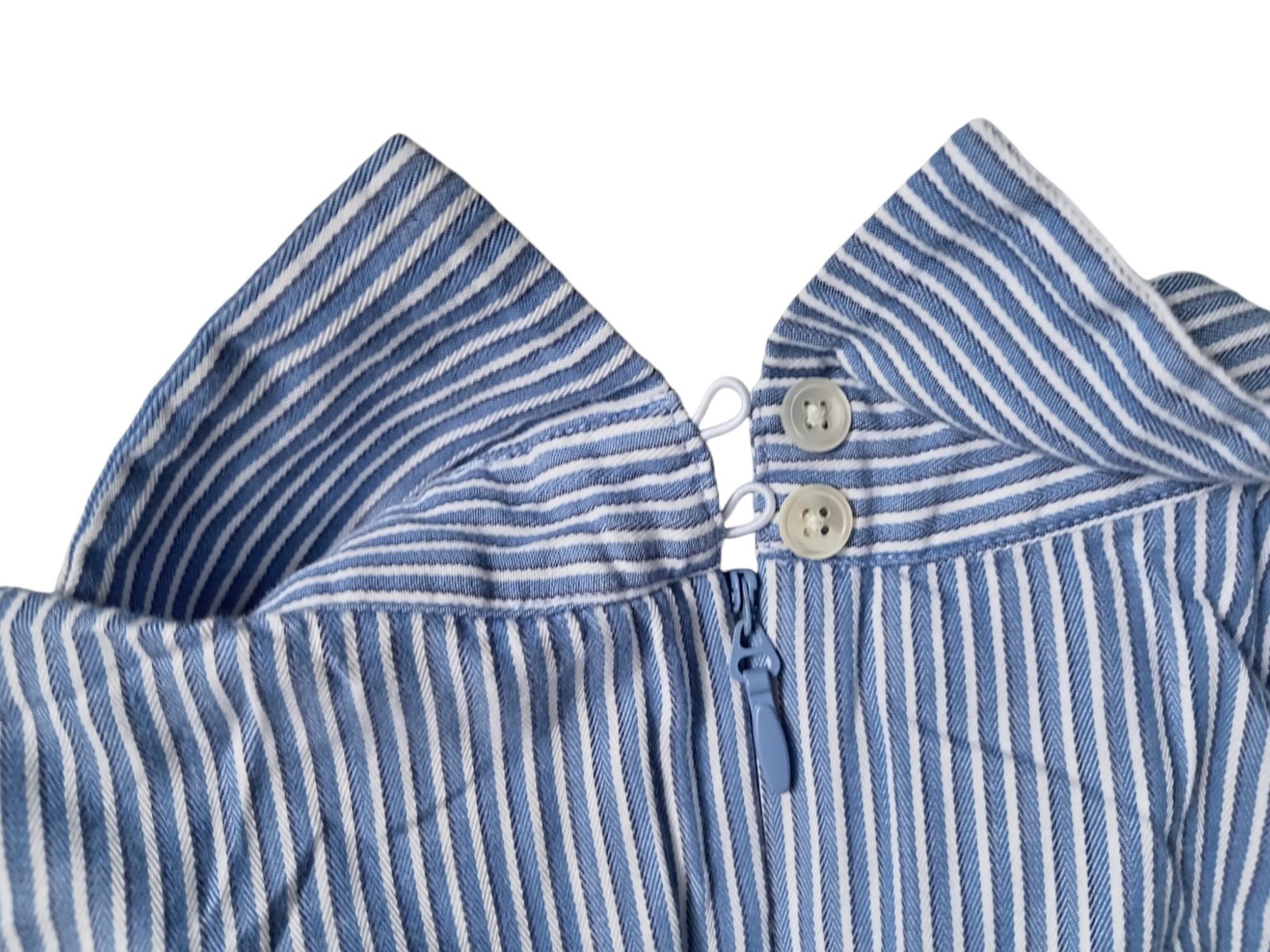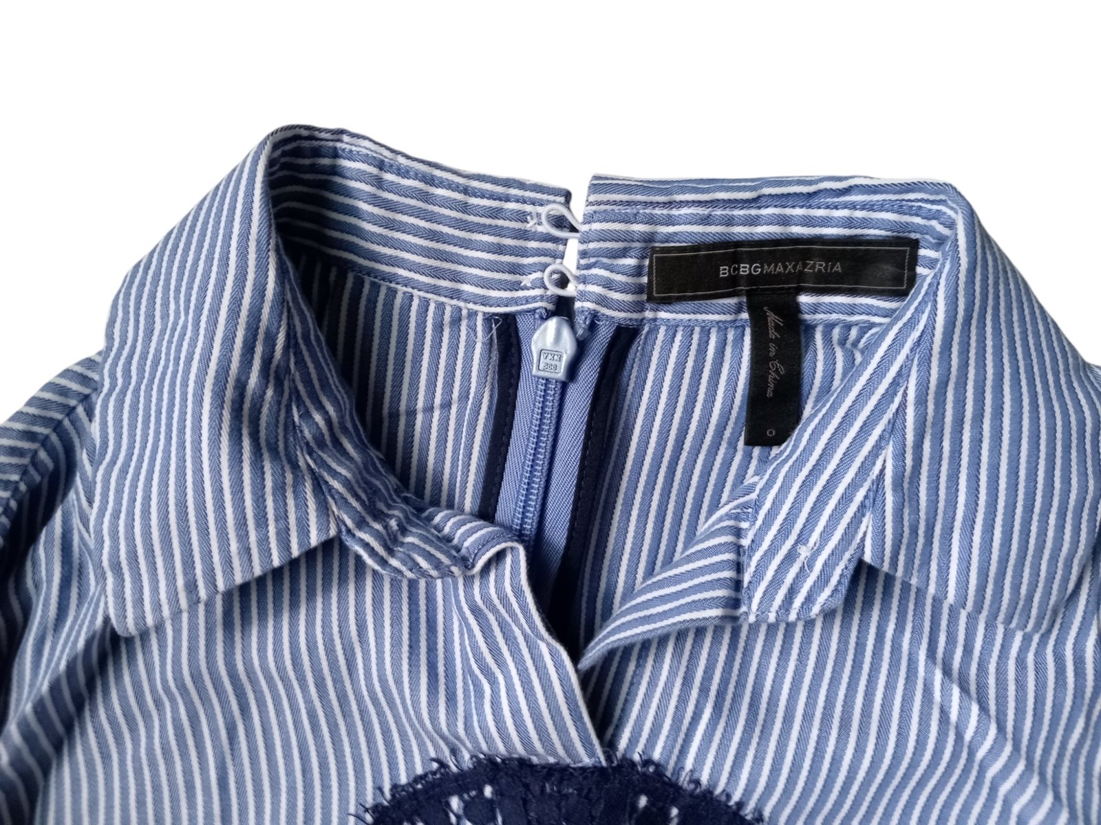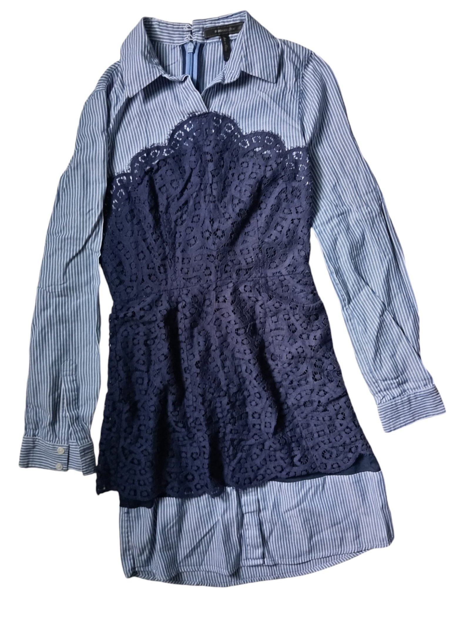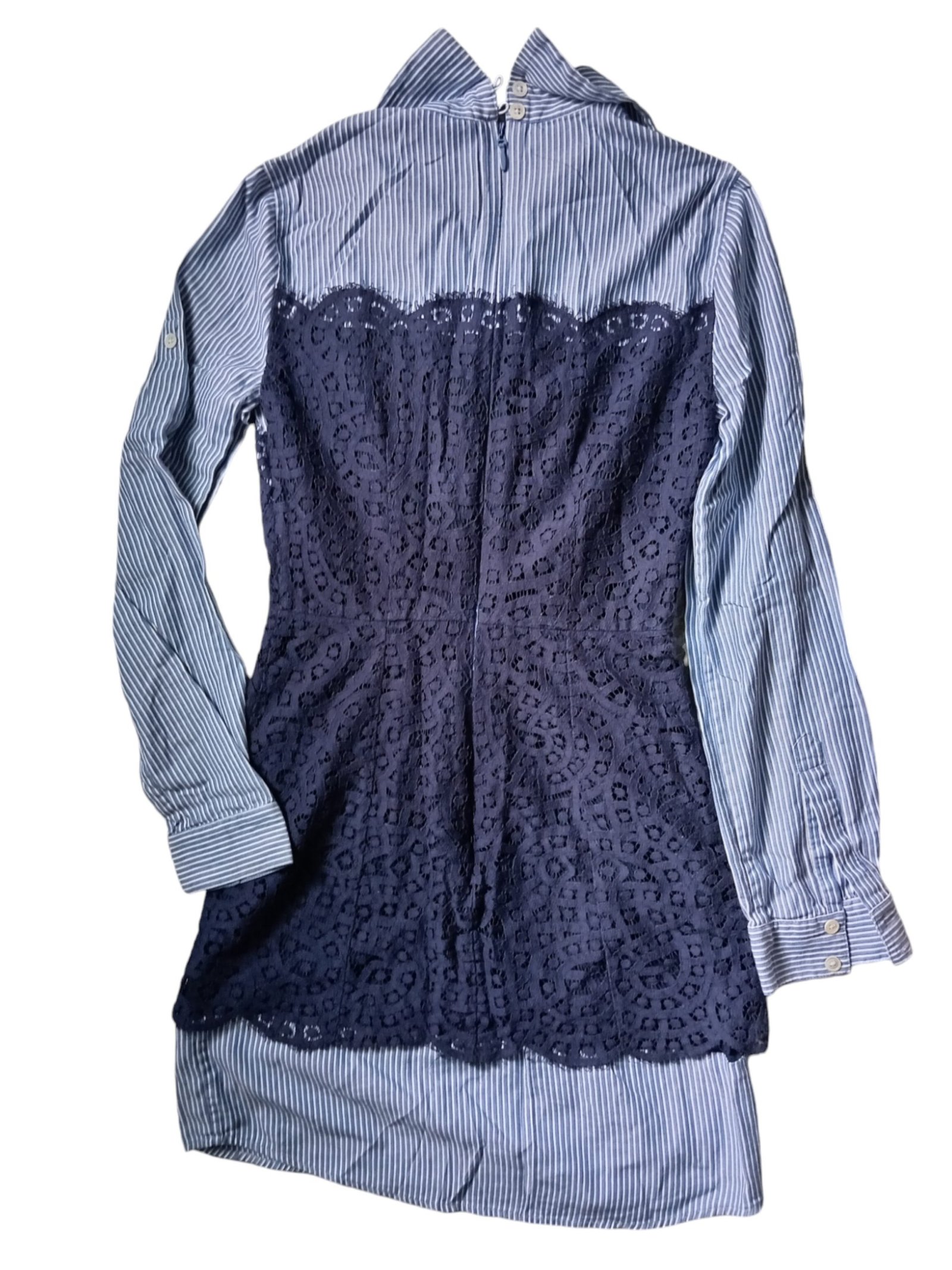 Vestido estilo camisero con diseño de encaje qué ajusta en la cintura Talla 0. Color azul de rayas