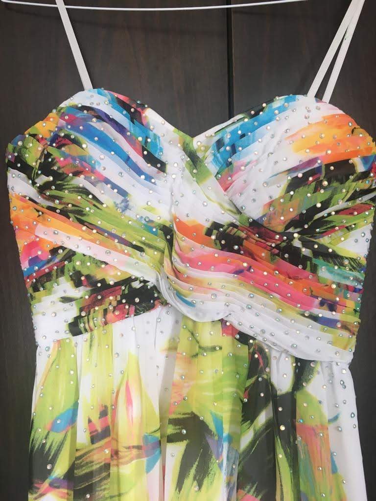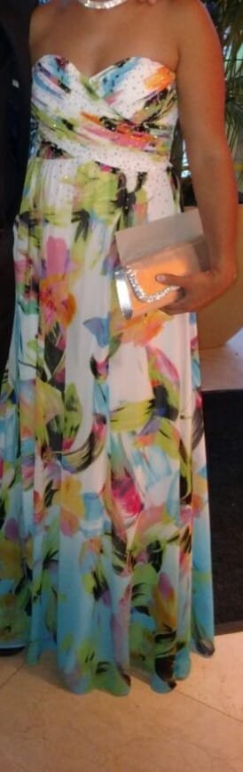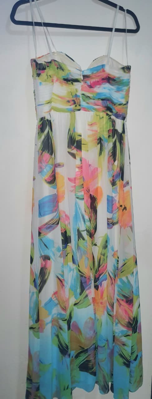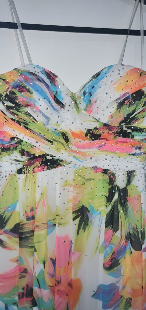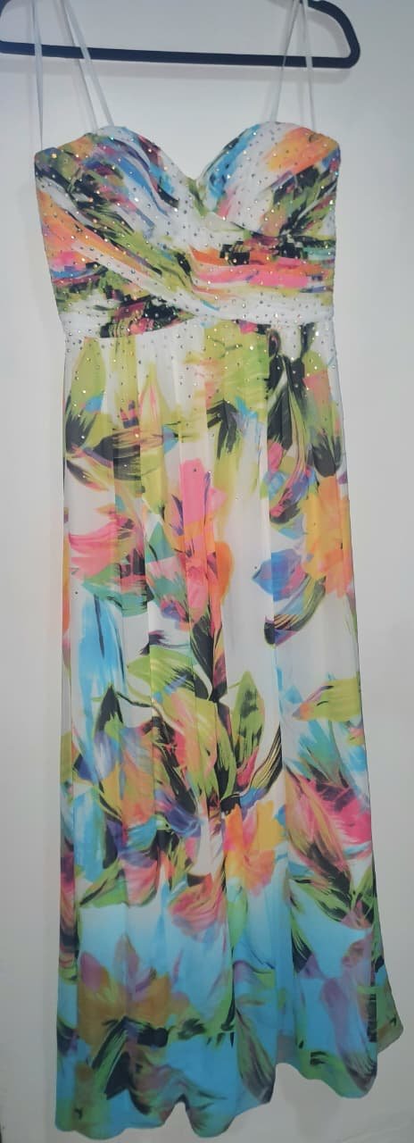 Vestido largo, elegante, estampado, con piedritas brillantes decorativas ideal para ecentos