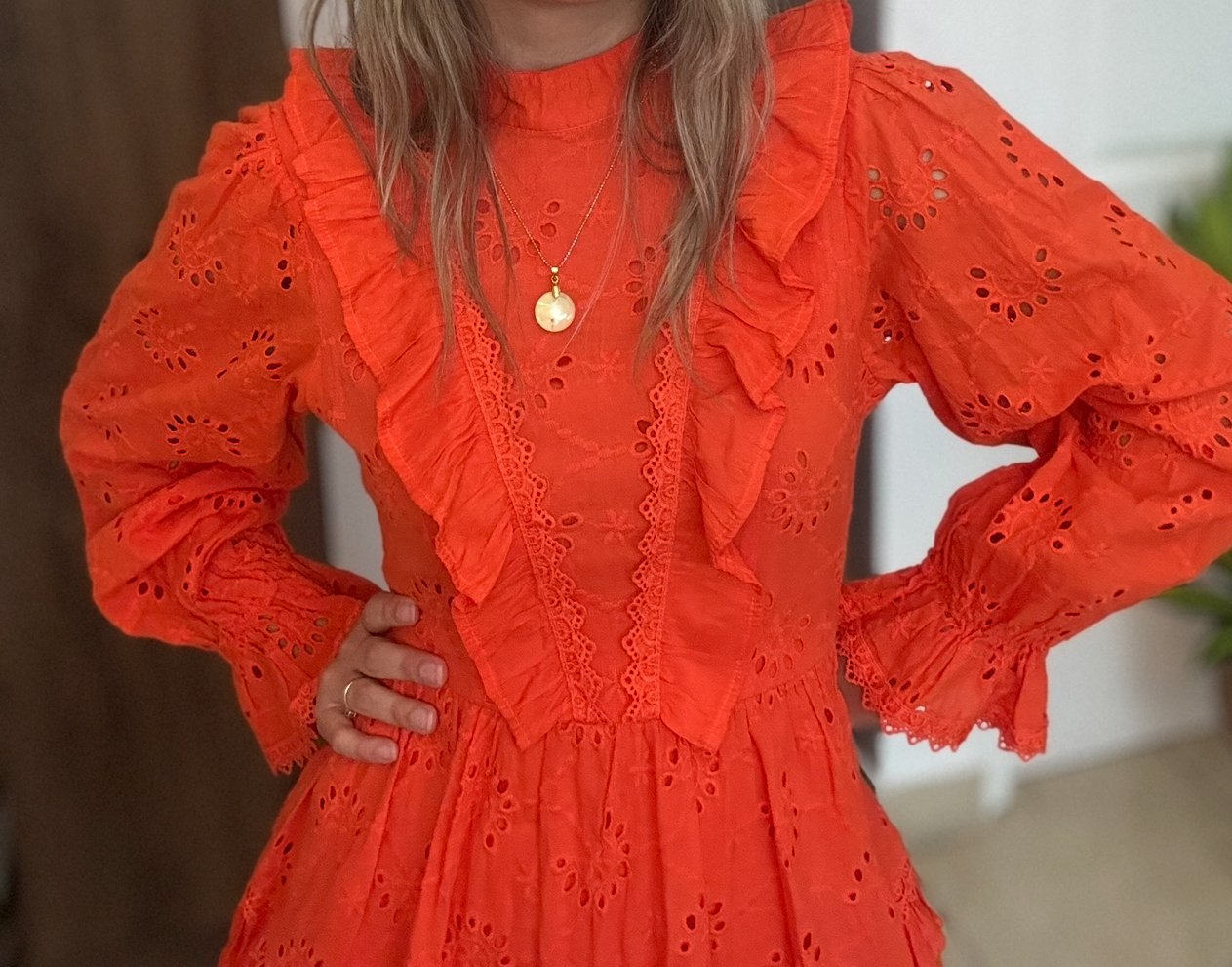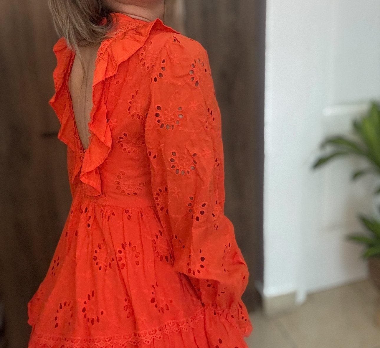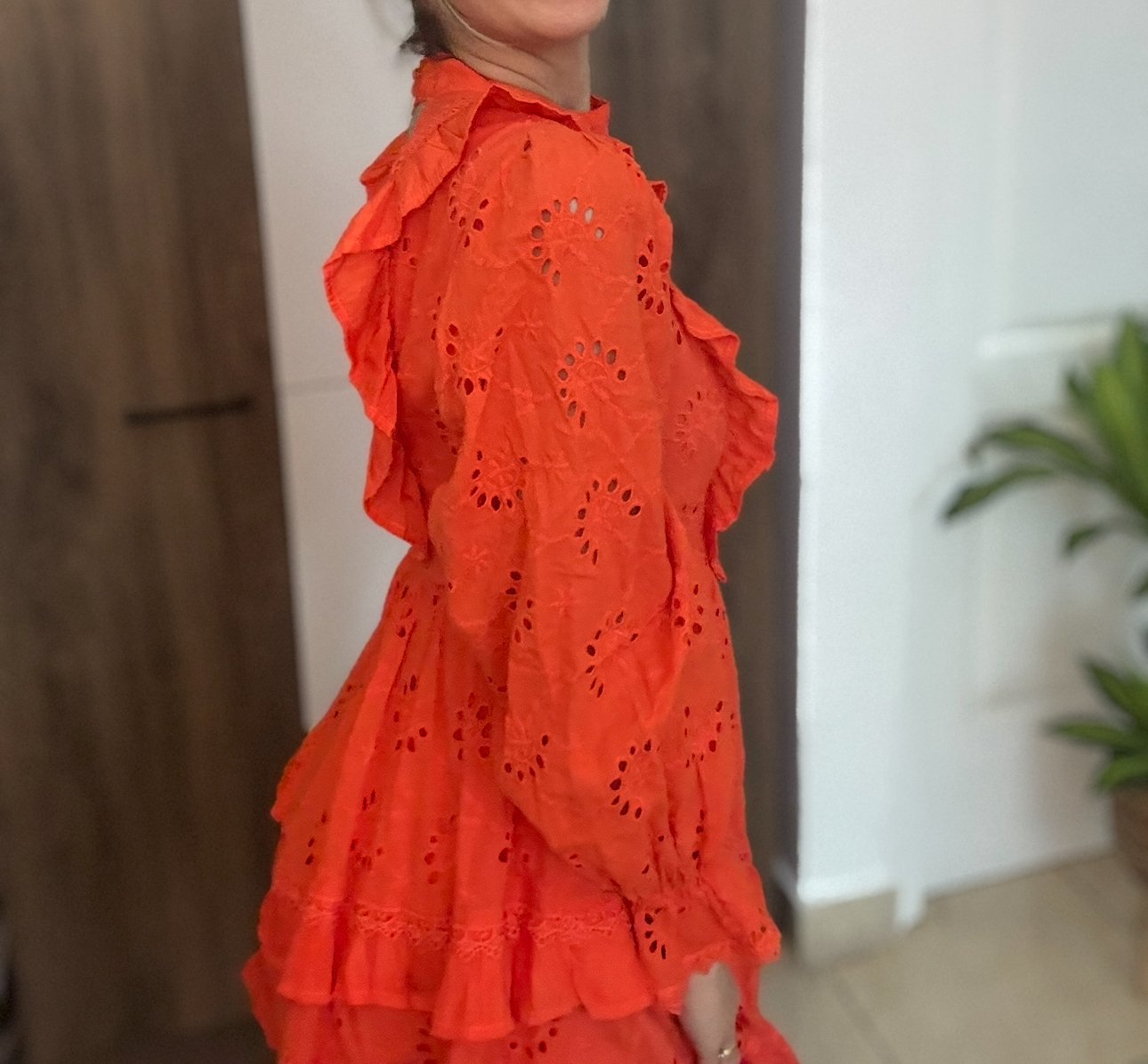 Vestido Lizette Collection, naranja de manga larga, diseño femenino y romántico con detalles bordados y perforados tipo broderie anglaise. Cuenta con volantes en el pecho, mangas y en la parte inferior de la falda, brindándole un toque elegante y coqueto. Su corte es ajustado en la cintura, realzando la silueta, y el largo llega justo por encima de la rodilla. Ideal para eventos casuales, salidas al aire libre o reuniones especiales. Talla small. Solo un uso.