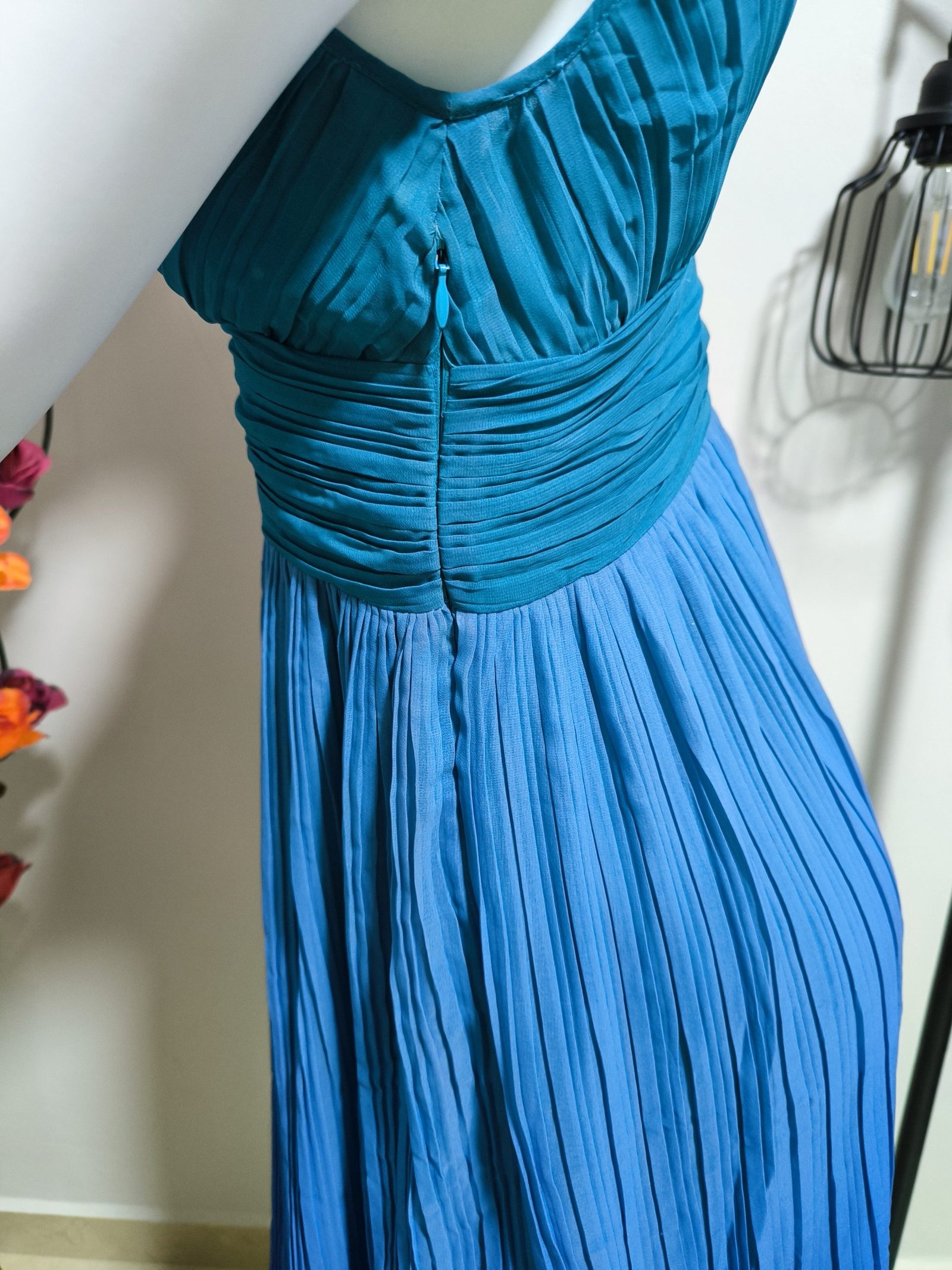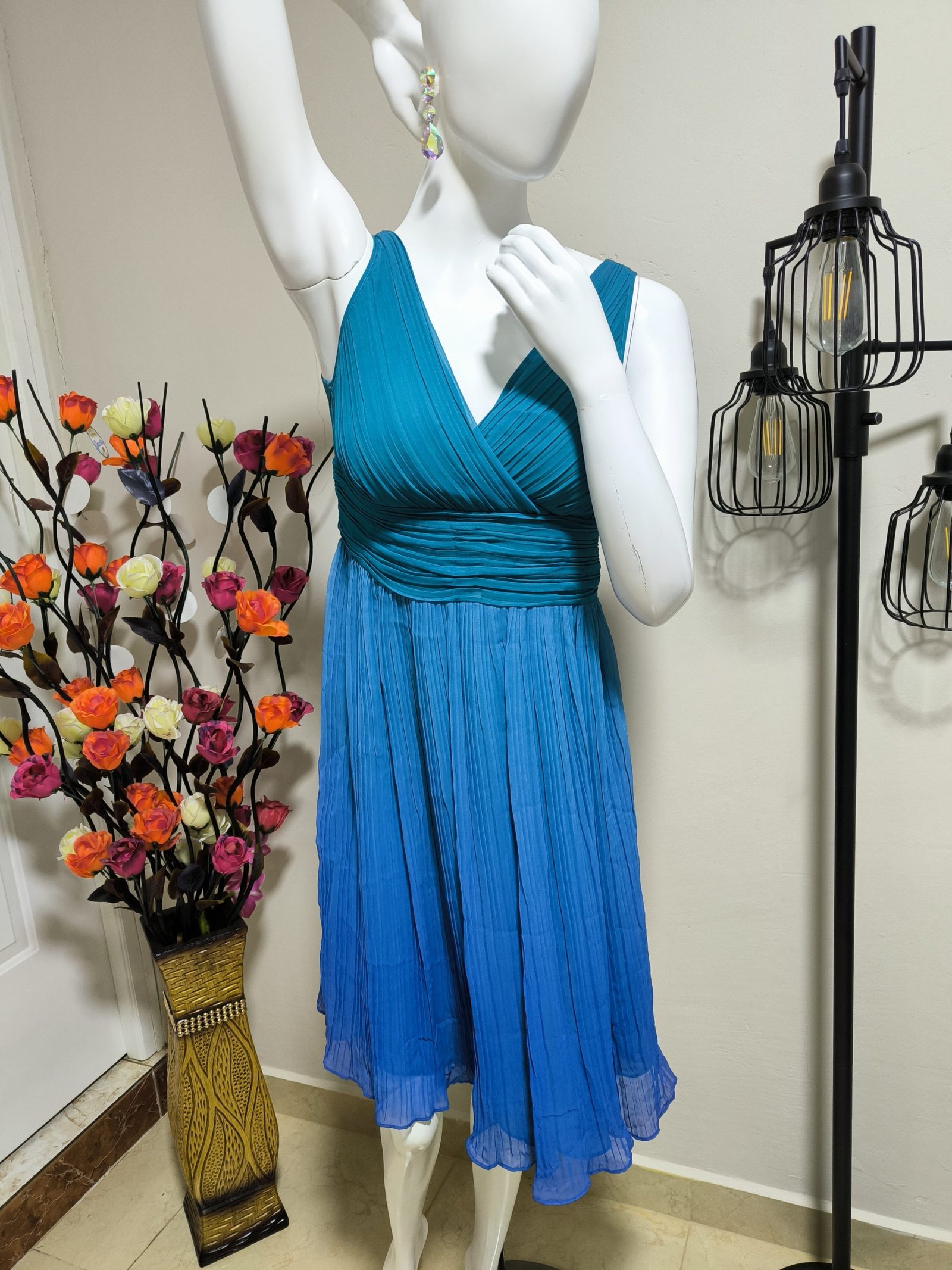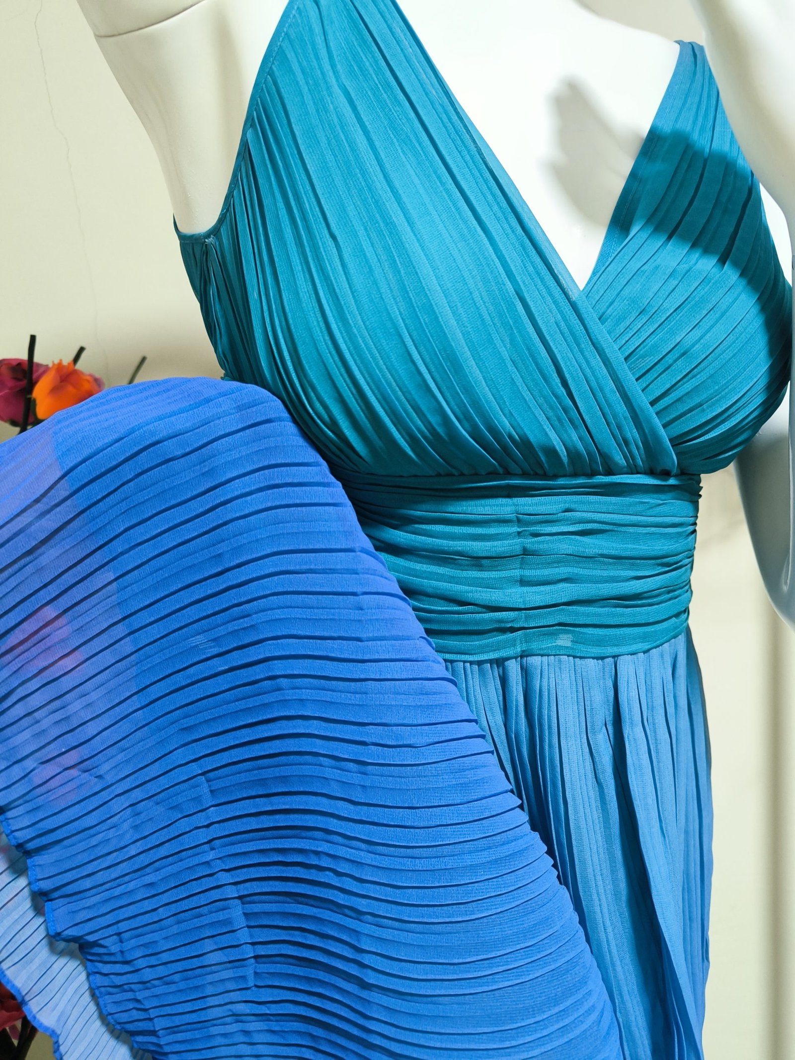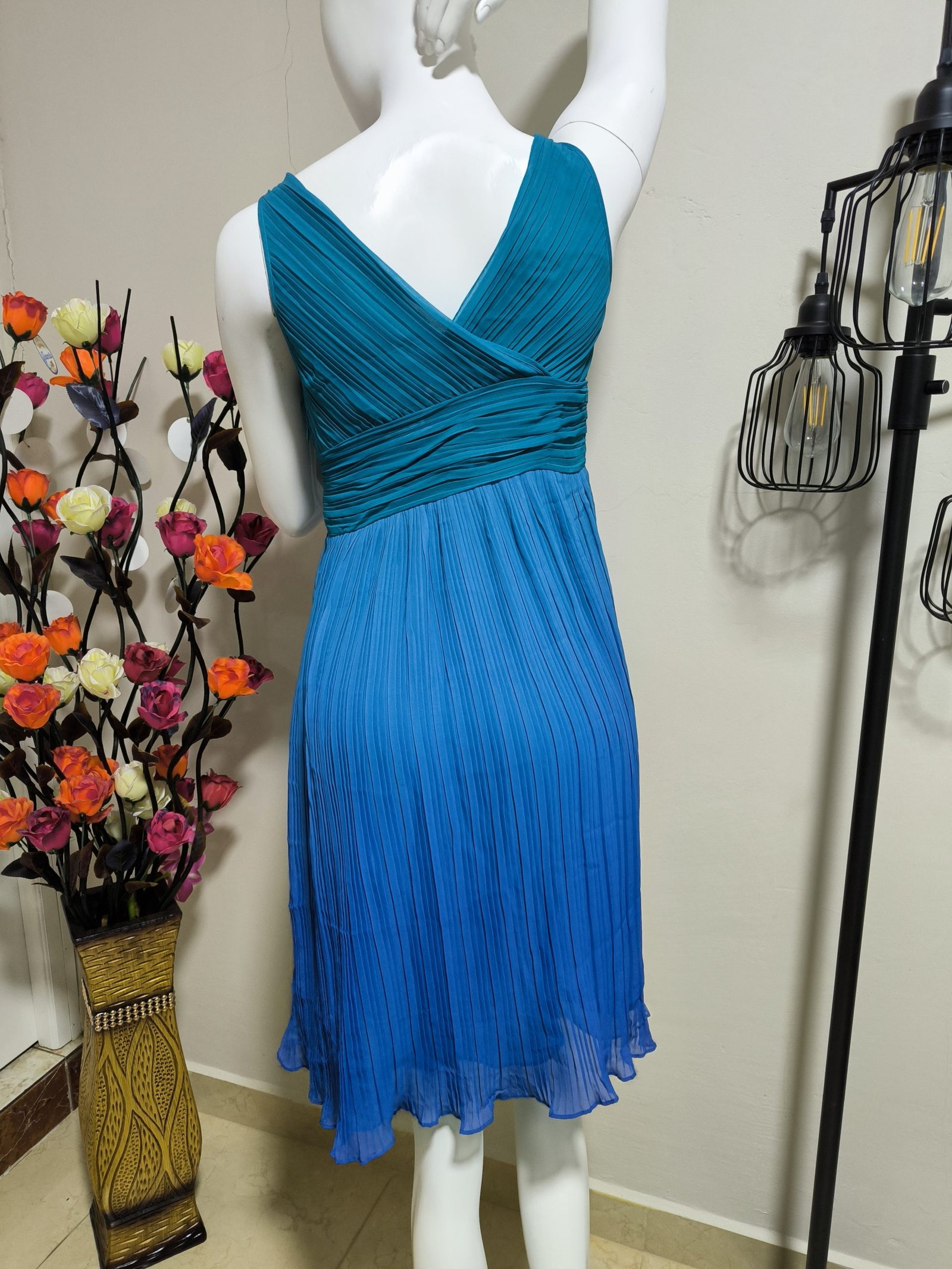 Vestido plisado en colores degradados a turquesa, escote en V, sin mangas. Talla: 2 (posible M/L). Marca: Sigrid Olsen. Zipper lado derecho, largo total 97 cm y cintura 72 cm.