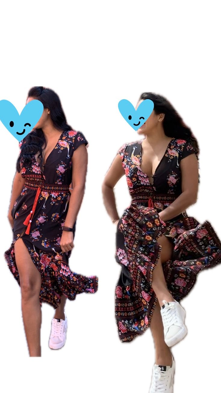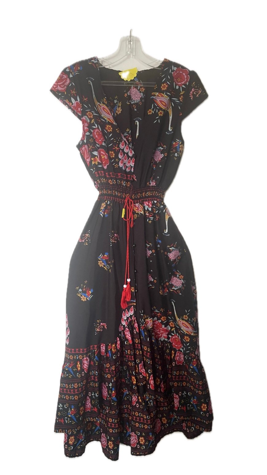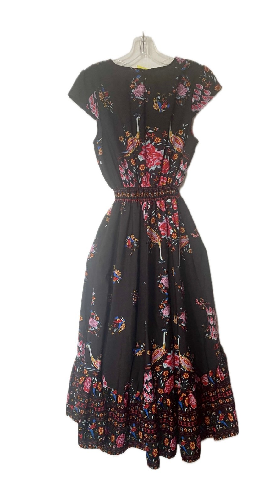 Lindo vestido negro con estampado de colores rosa amarillo rojo y celeste con una arandela que crea un lindo movimiento. Es talla S pero aplica para M