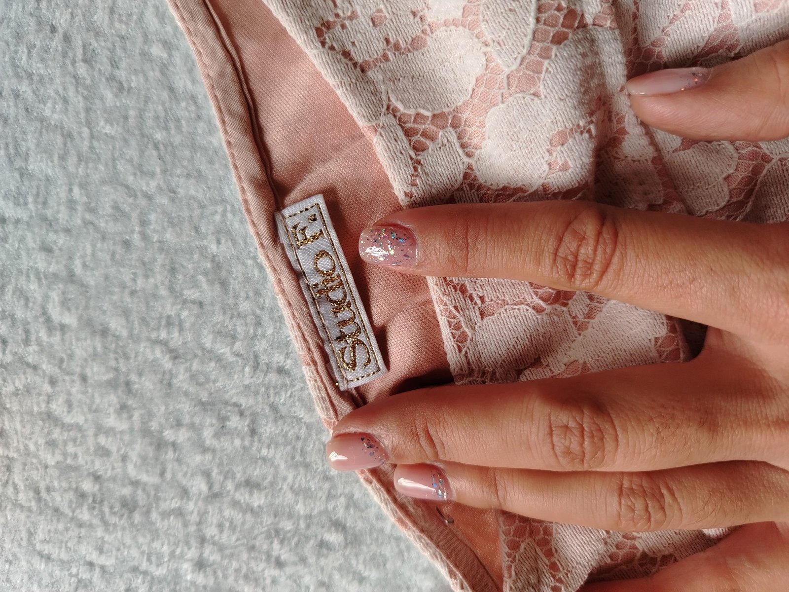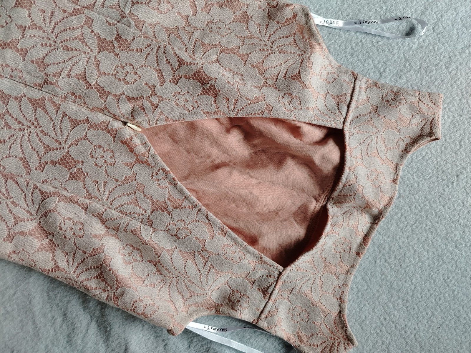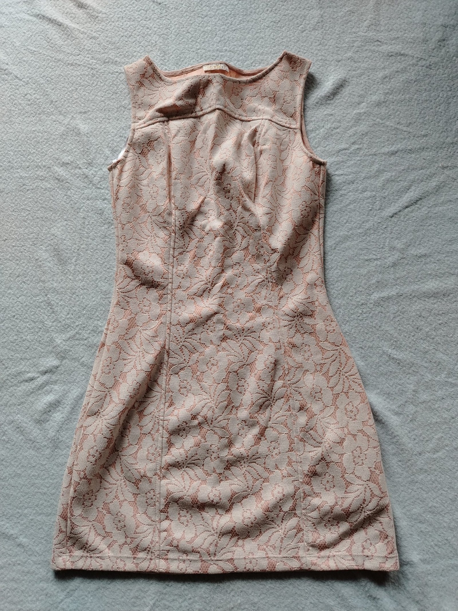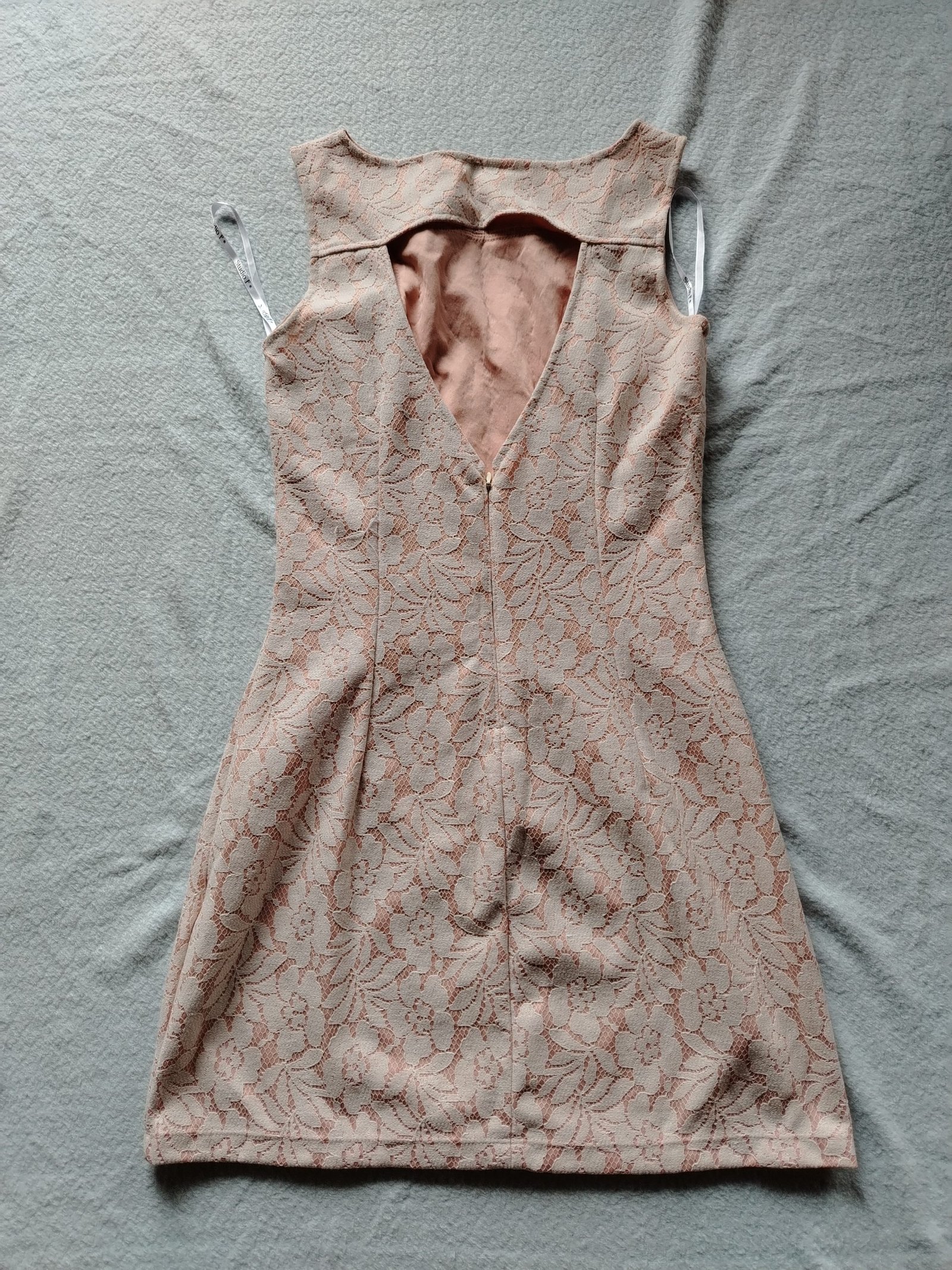 Hermoso mini vestido rosa con detalles de encajes florales, en la espalda tiene una pequeña apertura. Lindo entalle para resaltar la cintura.