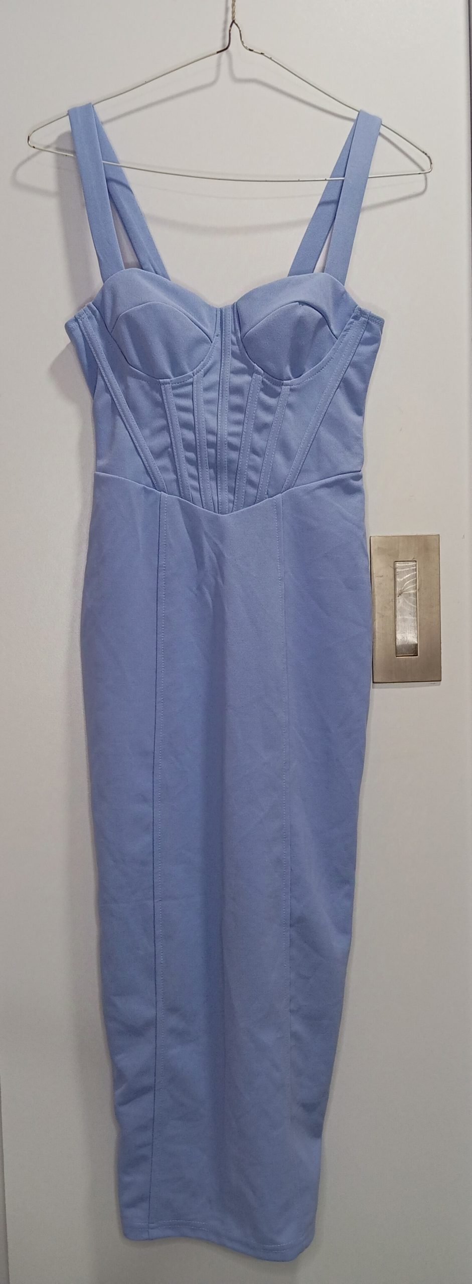 Vestido totalmente nuevo, sin usar. Vestido sin manga, largo, por debajo de la rodilla. Estilo corcel en parte superior. Color: celeste Disponible 1 pieza.