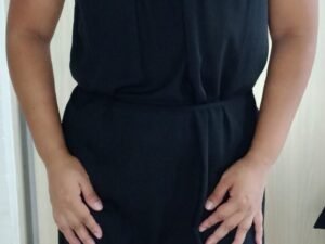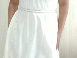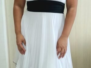 Vestido blanco con cordón negro que se amarra en la espalda El vestido llega a la rodilla o un poco más corto Tiene doble tela en la parte de abajo, no transparencia