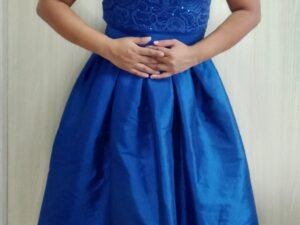 Elegante vestido azul marino de la marca forever Falda con vuelo de quinceañera Corto en la parte de alfrente y largo en la parte de atrás. Ceñido a la cintura por un lazo que se amarra atrás.