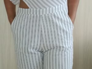 Elegante Jumsuit blanco con rayas negras One shoulder Pantalón con bolsillos y apertura en los costados del pantalón Marca Lulumari Cuenta con ziper a un costado
