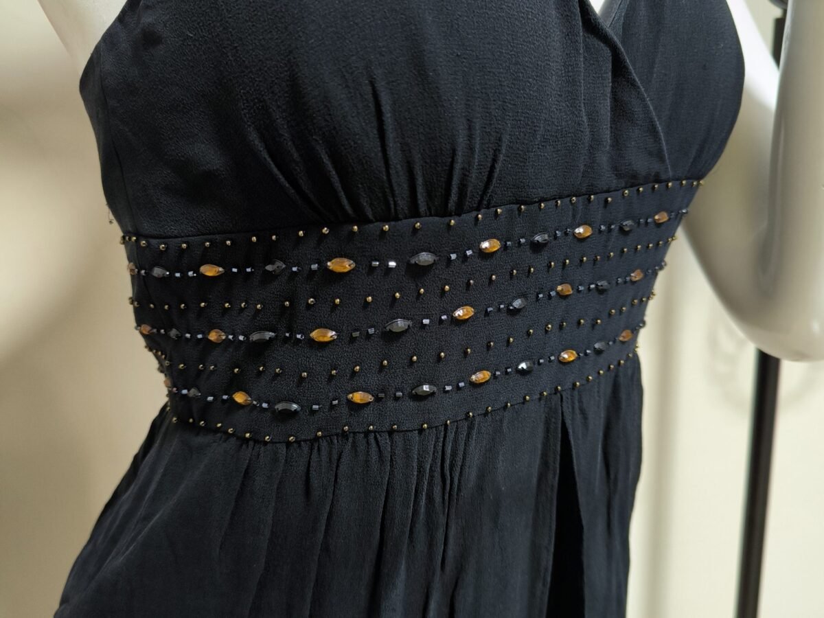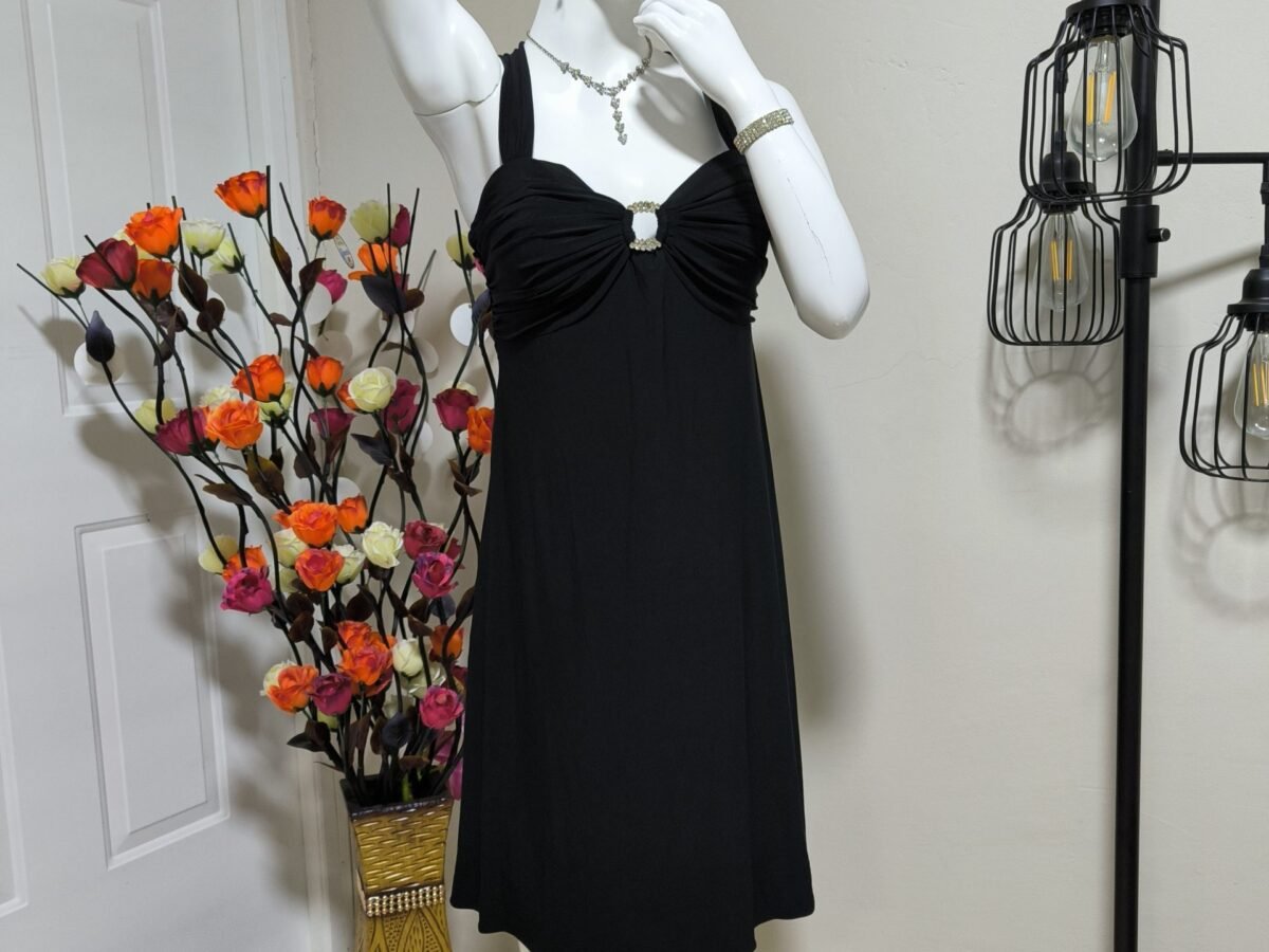 Vestido corto liso en color negro, con diseño de pedrería en la cintura, corte halter straps, zipper atrás, forro negro. Talla: 4 (posible S/M). Marca: Nine West. 100% Seda.