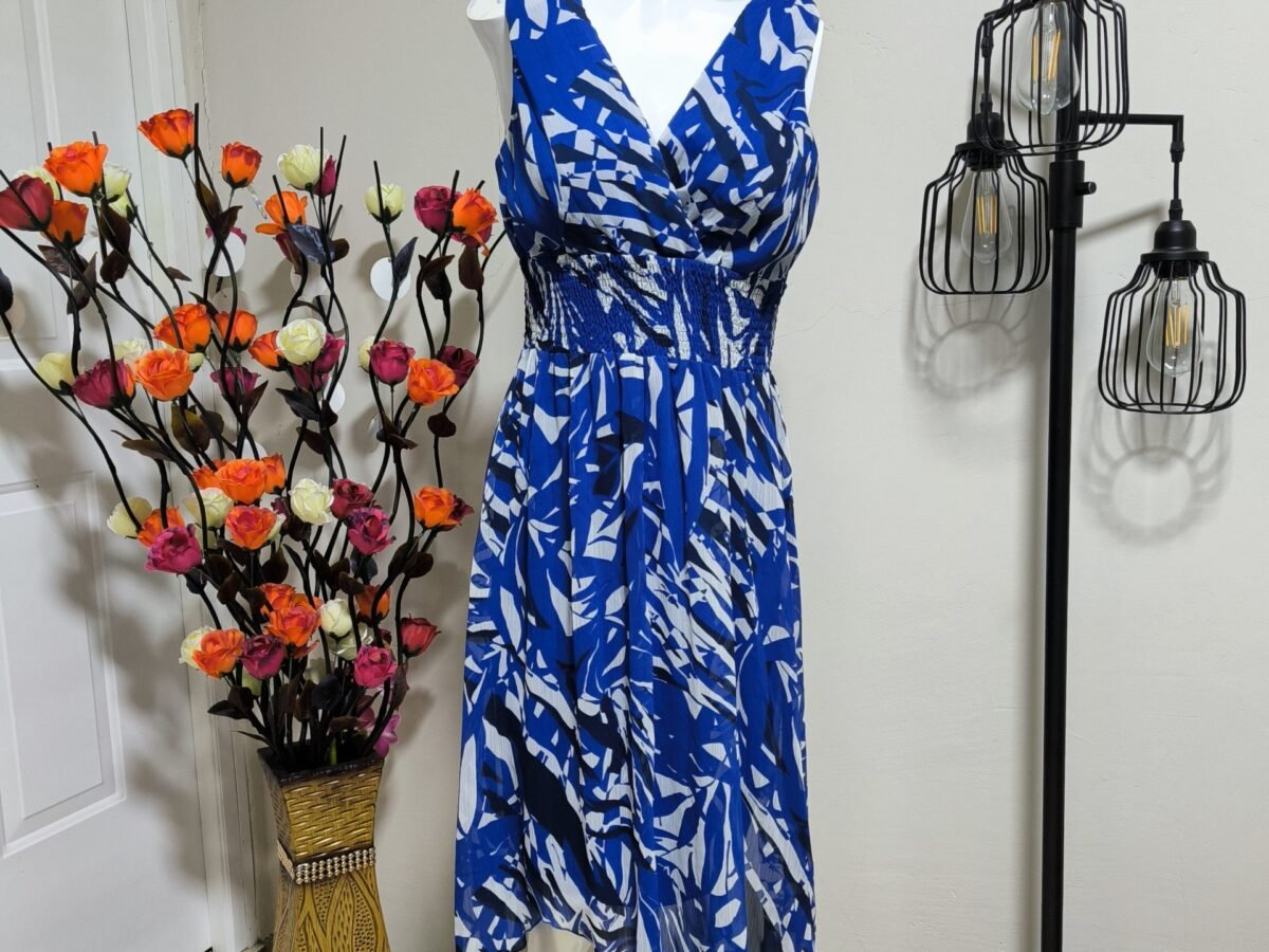 Vestido tipo coctel estampado en colores azul, escote en V, cintura corrugada expandible, falda en corte de picos. Talla: 12. Marca: Rabbit Designs. 100% Polyester.