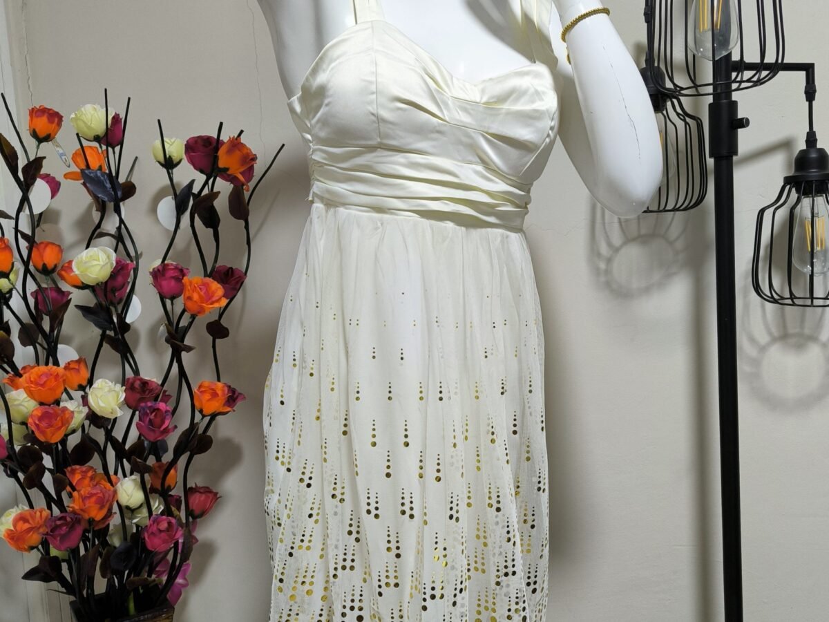 Vestido tipo coctel, color blanco hueso con detalles en dorado y cinturón adherido. Talla: 7 (posible M). Marca: City Triangles. Zipper atrás, largo total 96 cm y cintura 72 cm, 3% spandex.