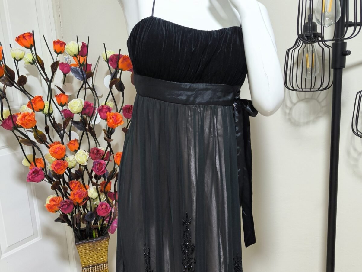 Vestido tipo coctel elegante en color negro, con forro interno tipo seda en tono champagne, detalles de pedrería, cinturón y escote tipo spaghetti straps. Talla 12. Marca S. L. Fashions. 10% spandex.