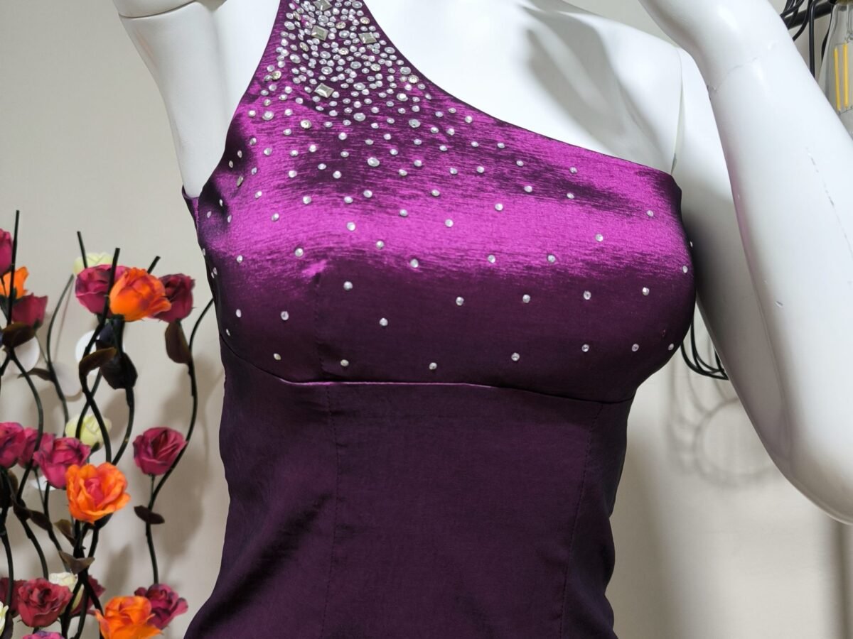 Vestido corto tipo one shoulder en color morado brillante, diseño de pedrería en plateado y corte de falda acampanado. Zipper lado izquierdo. 26% nylon. Marca La Scala USA. Talla L (corre pequeño posible), busto 80 cm, cintura 70 cm, largo total 85 cm.
