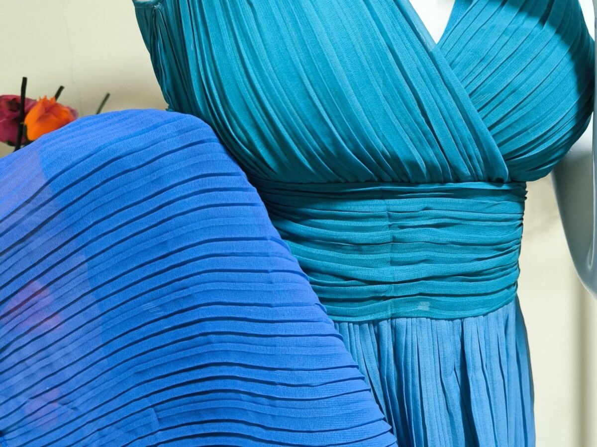 Vestido plisado en colores degradados a turquesa, escote en V, sin mangas. Talla: 2 (posible M/L). Marca: Sigrid Olsen. Zipper lado derecho, largo total 97 cm y cintura 72 cm.