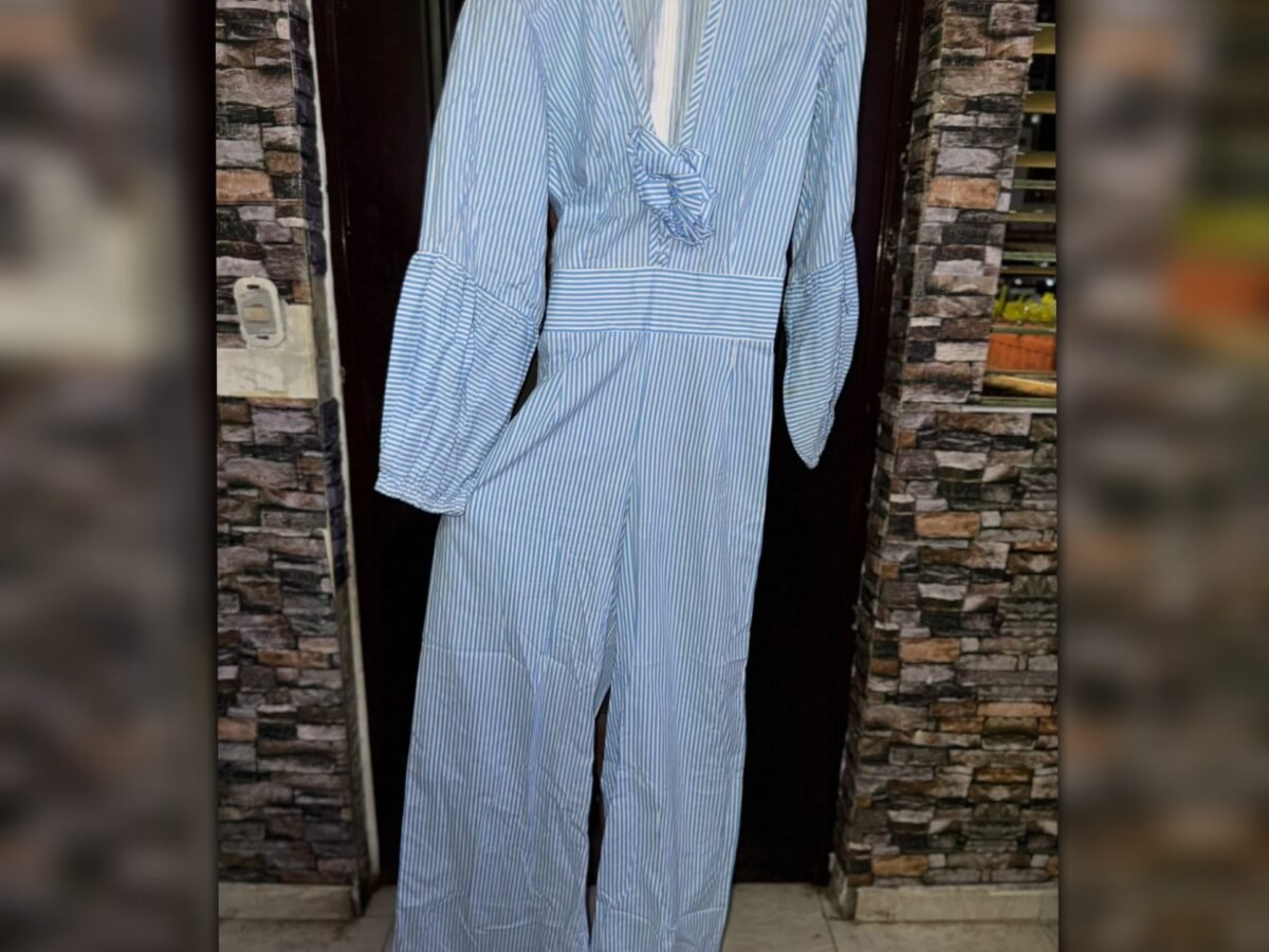 Jumpsuits celeste marca Lina Lemus Colombia, basta ancha, manga larga, broche de flor