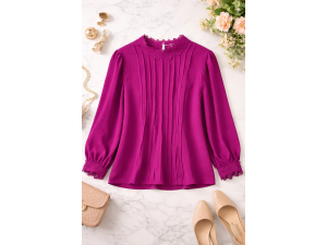 Elegante blusa fucsia vibrante con delicados detalles de encaje en cuello y mangas, perfecta para darle un toque sofisticado y femenino a cualquier outfit.