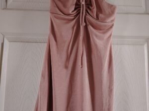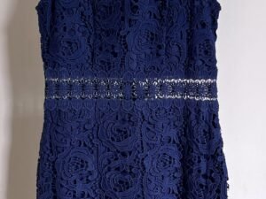 Elegante vestido azul marino de la marca forever Falda con vuelo de quinceañera Corto en la parte de alfrente y largo en la parte de atrás. Ceñido a la cintura por un lazo que se amarra atrás.
