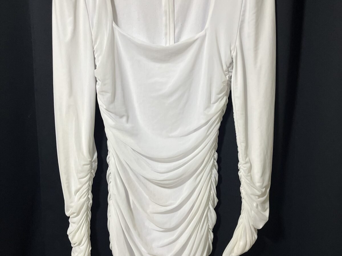 Vestido blanco hueso, marca BCBGeneration, escote y espalda en V, con lazos en los hombros. Tiene su forro y cuenta con zipper en la espalda. Es elegante y vestidor. Nuevo sin etiquetas. Talla 10.