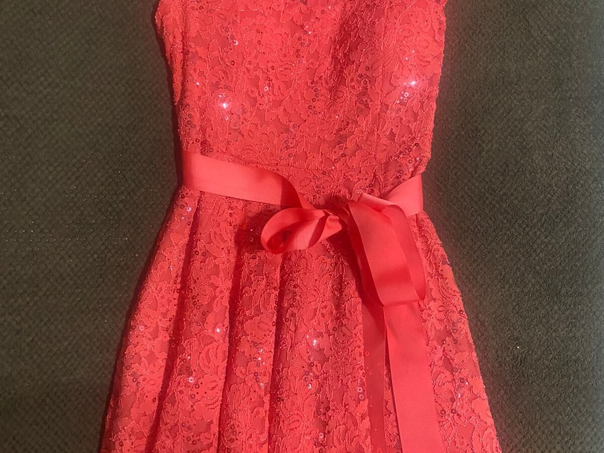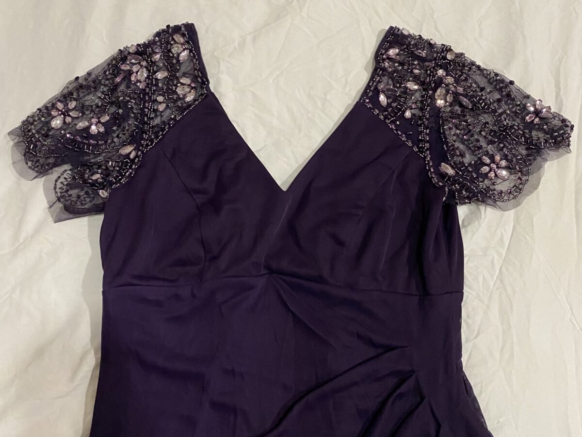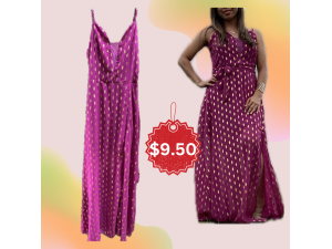 Vestido fuscia con estampado dorado que parece una huella, tiene una abertura lateral. Trae un cintillo a juego con el vestido. Ligera transparencia en el escote en V. Poco uso