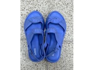 Sandalia talla 6 marca Melissa Color azul lavanda, muy femenino y combinable. Diseño con detalles tipo nudo en las tira, cómodo, flexible y vegano material. Suela en buen estado, con desgaste leve normal por uso (ver fotos)