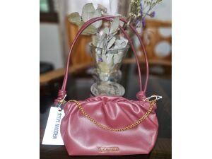 Elegante cartera de noche de color rojo, confeccionada en un material suave y cómodo. Su diseño es compacto y estilizado, ideal para eventos nocturnos. La cartera cuenta con un colgante en cadena dorada, que añade un toque de lujo y distinción. La cadena dorada es delgada y delicada, proporcionando un contraste brillante con el vibrante tono rojo del accesorio. Está pensada para ser llevada de forma cómoda, ya sea colgándola del hombro o sujetándola de manera más elegante, y es perfecta para complementar.