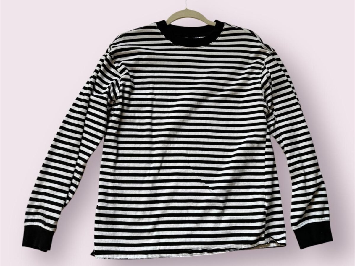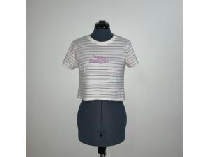 T-shirt con rayas, marca Forever 21. Con mangas cortas, cuello redondo y leyenda bordada "happy thoughts".
